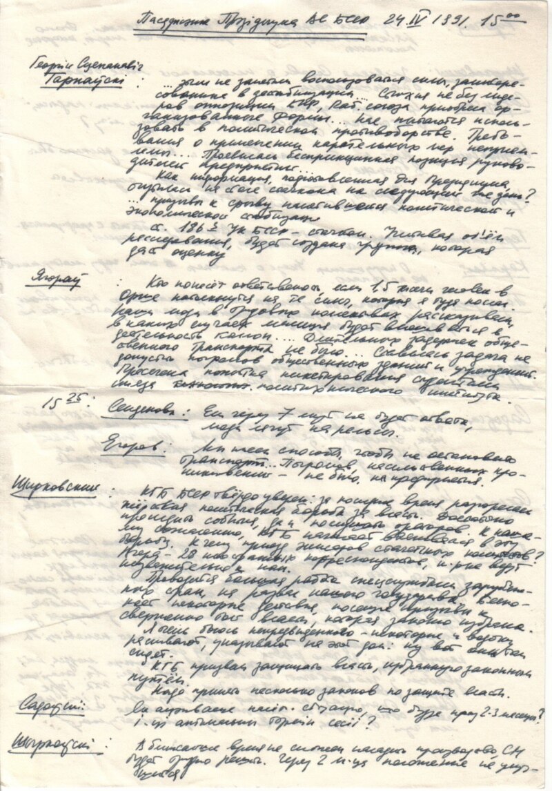 Перад пачаткам пасяджэньня Прэзыдыюму нам паведамілі, што ў Воршы рабочыя вылучылі ўмову: калі не прызначаецца сэсія ВС з разглядам палітычных патрабваньняў, будзе перакрытая чыгунка (груба кажучы – траса Масква-Парыж. Альбо Менск-Смаленск, як каму падабаецца. А таксама Ленінград - Адэса. Словам, увесь найважнейшы чыгуначны цэнтар эўрапейскай часткі СССР будзе заблякаваны).