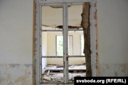 Спыняемся каля клюбу. Над вырванымі дзьвярыма — фрагмэнты «вітражоў», усярэдзіне — рэшткі сцэны, на супрацьлеглай сьцяне — чорныя квадраты «рубкі» кінамэханіка: