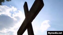 Дзяды-1989. Усталяваньне і асьвячэньне крыжа “Пакутнікам Беларусі” (з архіву З.Пазьняка)