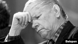Васіль Быкаў прамаўляе на Сойме БНФ, за сталом - Зянон Пазьняк. 1995, Менск, сядзіба БНФ