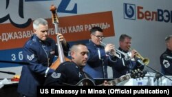 У суботу ўвечары ў Менску каля Ратушы выступіў джаз-бэнд аркестр вайскова-паветраных сіл ЗША. Перад гэтым музыкі наведалі музэй Вялікай Айчыннай вайны разам з амэрыканскім Chargé d’Affaires у Беларусі Скотам Роландам, паведамляе на сваёй старонцы ў Фэйсбуку Амбасада ЗША.