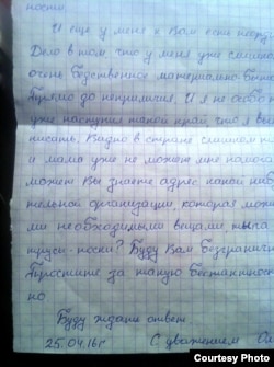 «Разумею, што мая просьба можа падацца недарэчнай, — піша ён, — але маё матэрыяльнае становішча бядотнае... Да непрыстойнасьці. Настаў такі крэс, што не магу не пісаць. Відаць, сытуацыя ў краіне вельмі цяжкая, бо мама мая, як я бачу, ужо ня можа мне дапамагаць. Можа вы ведаеце адрасы нейкіх арганізацыяў, якія б маглі даслаць за краты такія рэчы, як трусы, шкарпэткі? Буду вам вельмі ўдзячны за гэта. Яшчэ раз даруйце за такую недарэчнасьць».