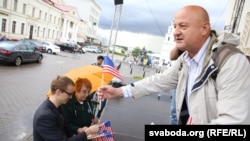 Каля менскай ратушы Ўладзімер Падгол і Алесь Таўстыка зладзілі акцыю, прысьвечаную Дню незалежнасьці ЗША. Фота Радыё Свабода
