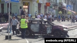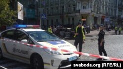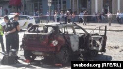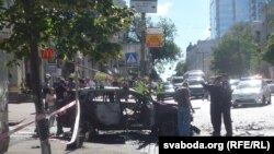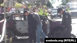 Скрыжаваньне вуліц Багдана Хмяльніцкага і Івана Франка ў Кіеве ачэпленае паліцыяй. На месцы працуюць праваахоўныя органы і СБУ. Відаць, што вокны аўтамабіля выбітыя, ён цалкам выгараў знутры.