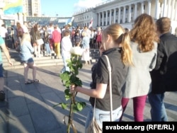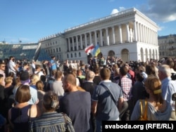 Удзельнікі акцыі — украінскія журналісты і палітыкі, а таксама беларусы, якія жывуць ва Ўкраіне — прыйшлі на Майдан з кветкамі, зьнічкамі і бел-чырвона-белымі сьцягамі. Яны скандуюць: «Жыве Беларусь!», «Слава Ўкраіне!».