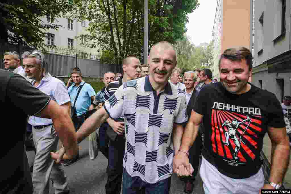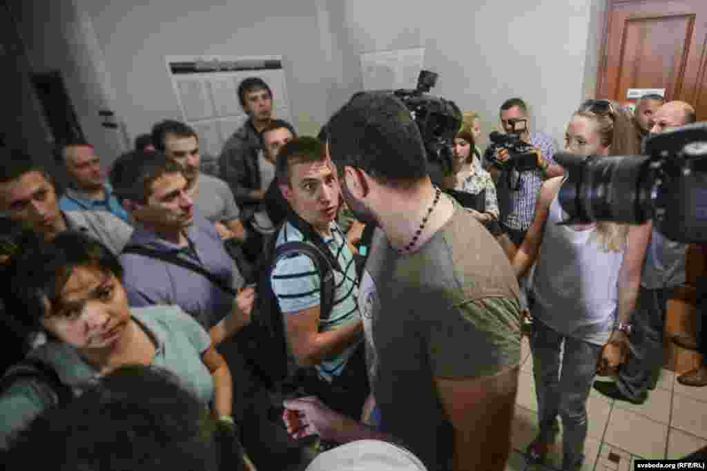 У адрозьненьне ад сваёй «групы падтрымкі», Уладзімер Япрынцаў пасьля вызваленьня ў залі суду ахвотна кантактаваў з прадстаўнікамі СМІ.