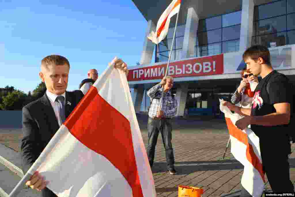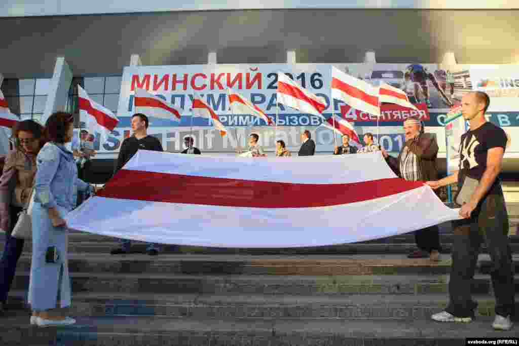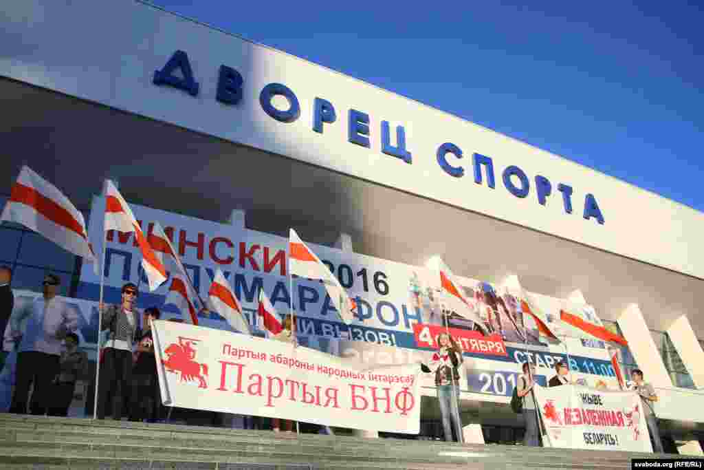 Каля менскага Палаца спорту адбыўся пікет Партыі БНФ пад бел-чырвона-белымі сьцягамі