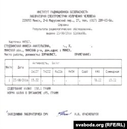 23 жніўня ўпершыню ў жыцьці я праверыла ўтрыманьне цэзію-137 у сваім арганізьме. Правярала ў лябараторыі спэктрамэтрыі Інстытуту радыяцыйнай бясьпекі «Белрад». Спэктромэтар выпраменьваньня чалавека — гэта адмысловы прыбор у выглядзе крэсла, у якім знаходзіцца спэцыяльны крышталь, які адзначае радыеактыўныя распады ў арганізьме. Затым спэктромэтар гэтыя сыгналы трансфармуе ў электрычны сыгнал і выдае вынік у бэкерэлях на кіляграм. Працягласьць вымярэньня — каля трох хвілін. Мой вынік па цэзіі-137 — 15,35 бэкерэля на кіляграм.