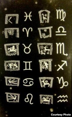 Рыбы — Пярун (маланка), Баран — аўчына, Бык — коньнік (Пагоня), Блізьняты — два Ваяры за Сонца, Рак — пава (дакладней, відаць, Паўлін), Леў — Пава, Дзяўчына — Жораў, Шалі — два Сонцы (восеньскае раўнадзенства?), Скарпіён — Алень з аленяняткам, Стралец — Ваяр зь дзідай, Казларог — Казёл з Сонцам на сьпіне, Вадаліў — Конь.