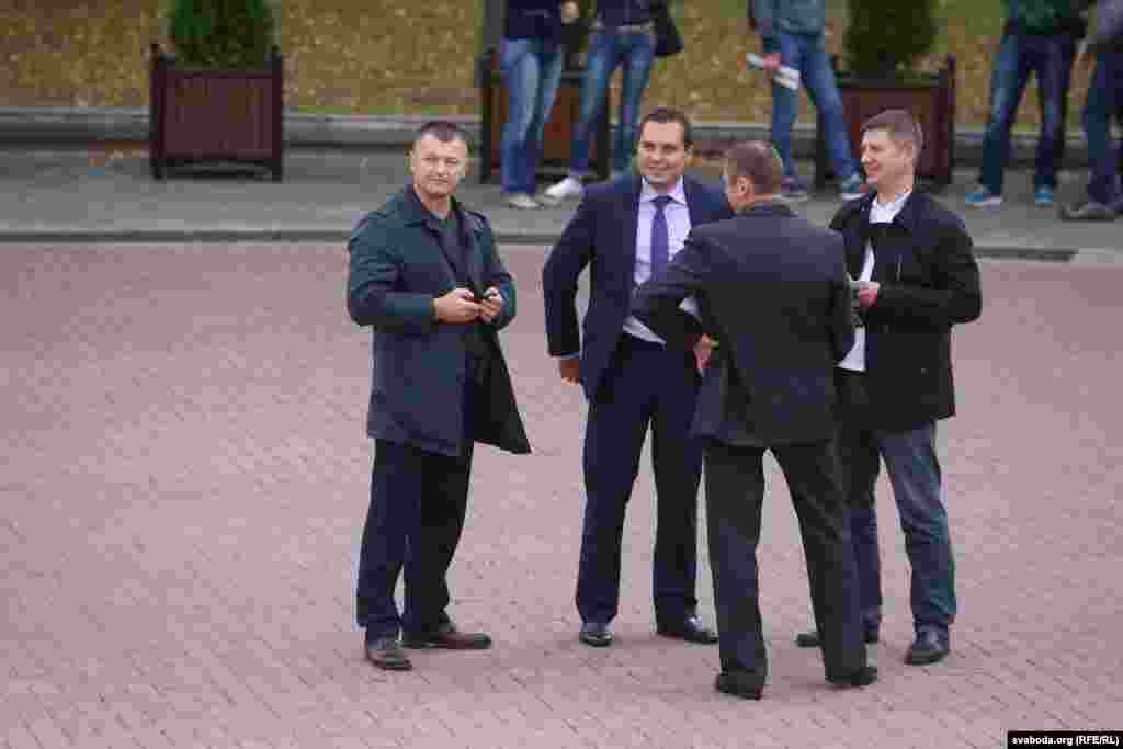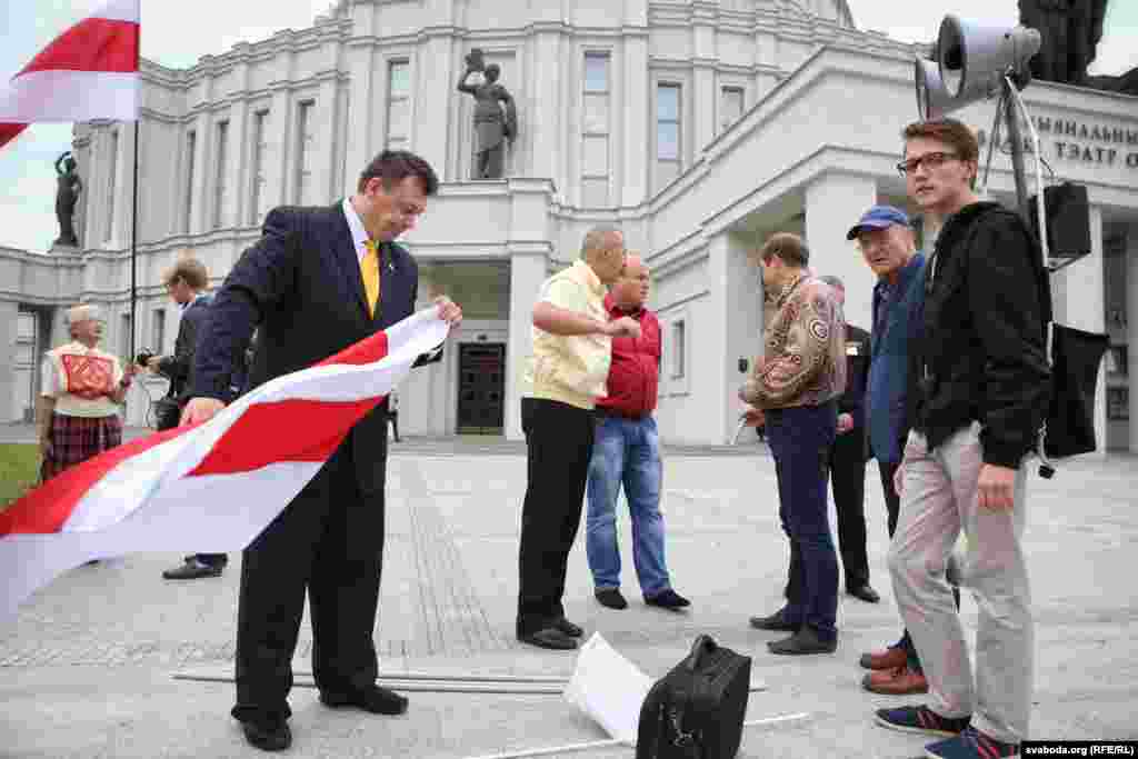 Аляксандар Таўстыка размаўляе з аховай, якая спрабуе прагнаць акцыю з прыступак тэатру