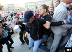 Мітынгоўцы скандавалі «Жыве Беларусь!», а міліцыянты ў цывільным павольна набліжаліся да эпіцэнтру акцыі. Некаторыя зь іх былі ў кепках з надпісам «Russia». Раптоўна вакол Дашкевіча пачалася цісканіна. Павал Севярынец заклікаў астатніх устаць у жывы ланцуг, каб не дапусьціць затрыманьняў. Людзі ў цывільным брутальна штурхалі пратэстоўцаў у розныя бакі, а тыя штурхалі іх у адказ. Справа амаль дайшла да бойкі. Журналістаў таксама спрабавалі адціснуць ад эпіцэнтру канфлікту. Супрацоўнік міліцыі ў форме пачаў складаць пратакол на кагосьці з удзельнікаў, але хутка сышоў. Прысутны тут камандзір Менскага АМАПу Дзьмітры Балаба быў вымушаны ўмяшацца і даў загад сваім падначаленым спыніць штурханіну.