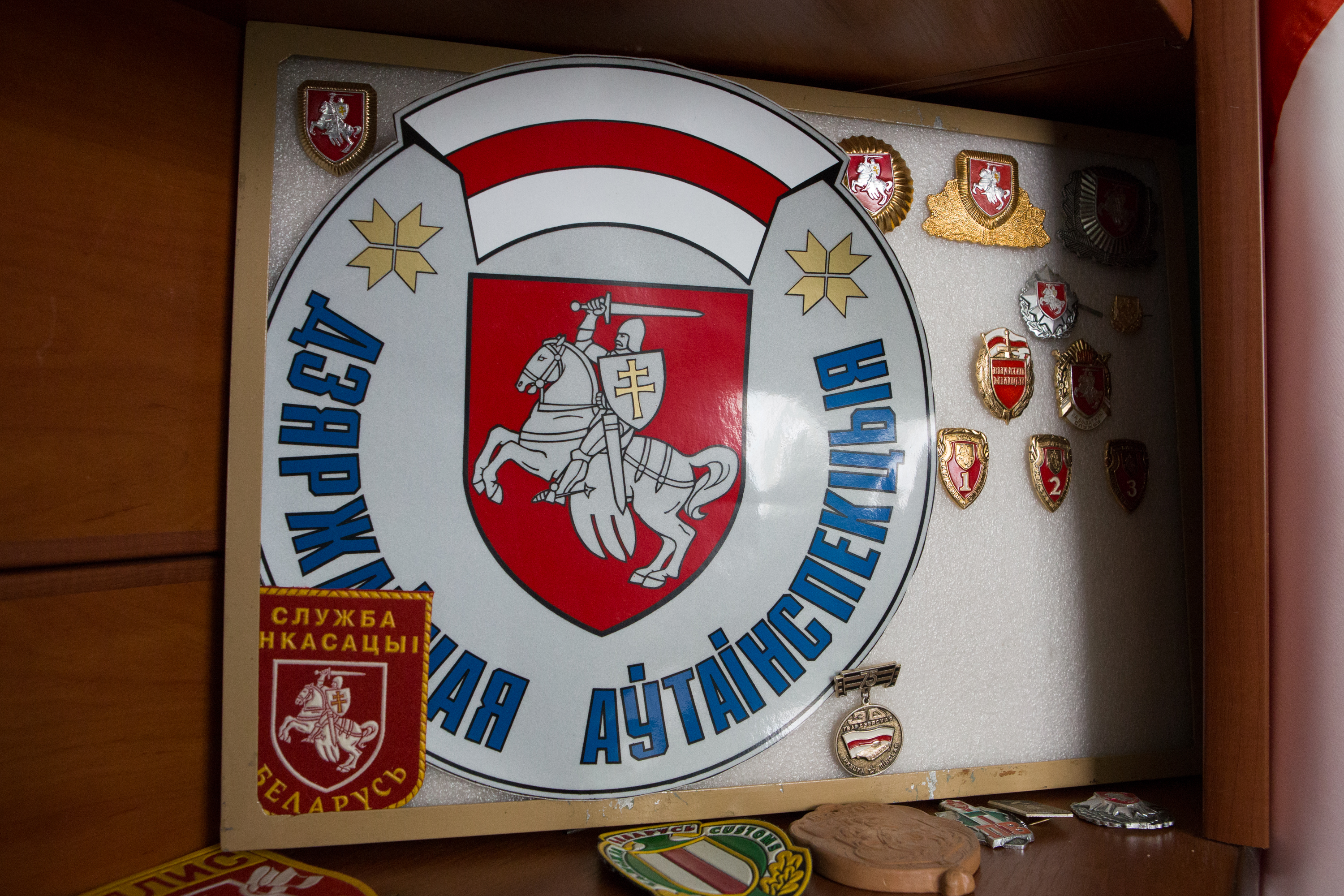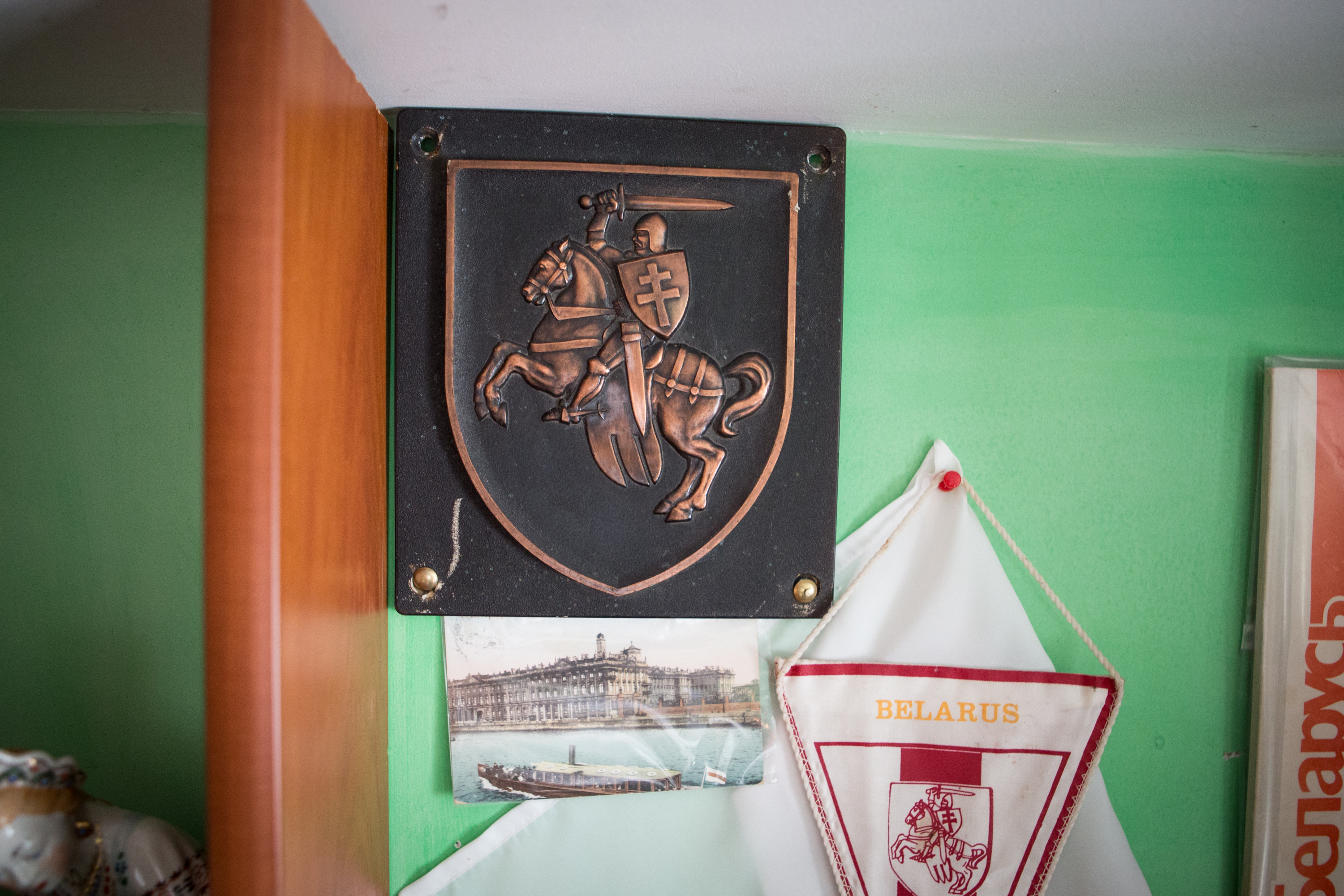 Таксама вельмі не па-камуністычнаму на ўваходзе ў музэй вісіць бел-чырвона-белы сьцяг і цэлая калекцыя «Пагоняў».