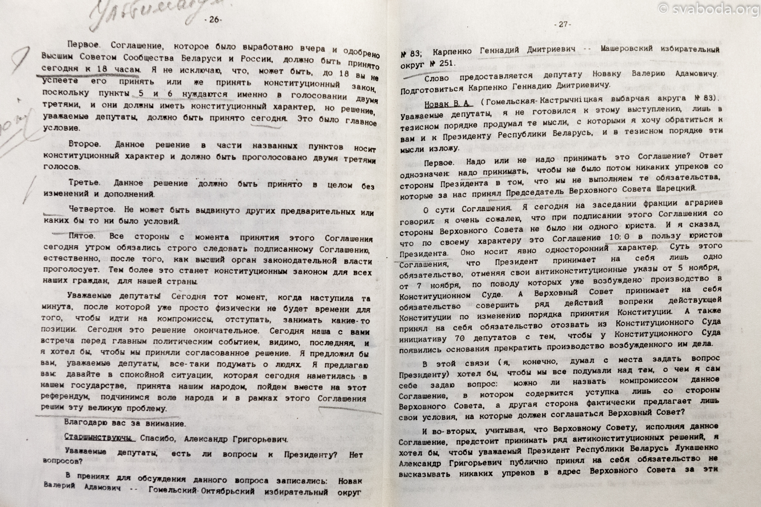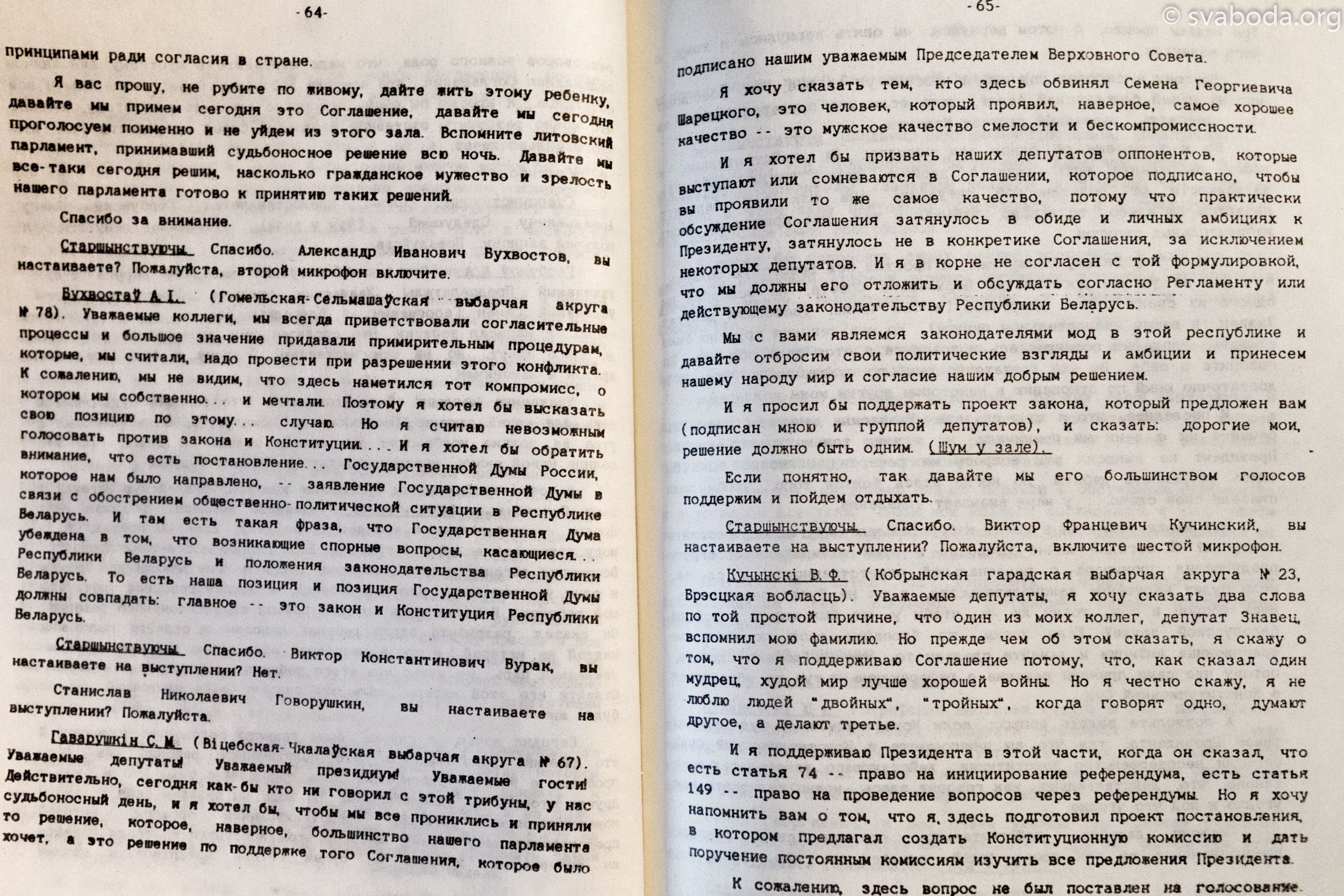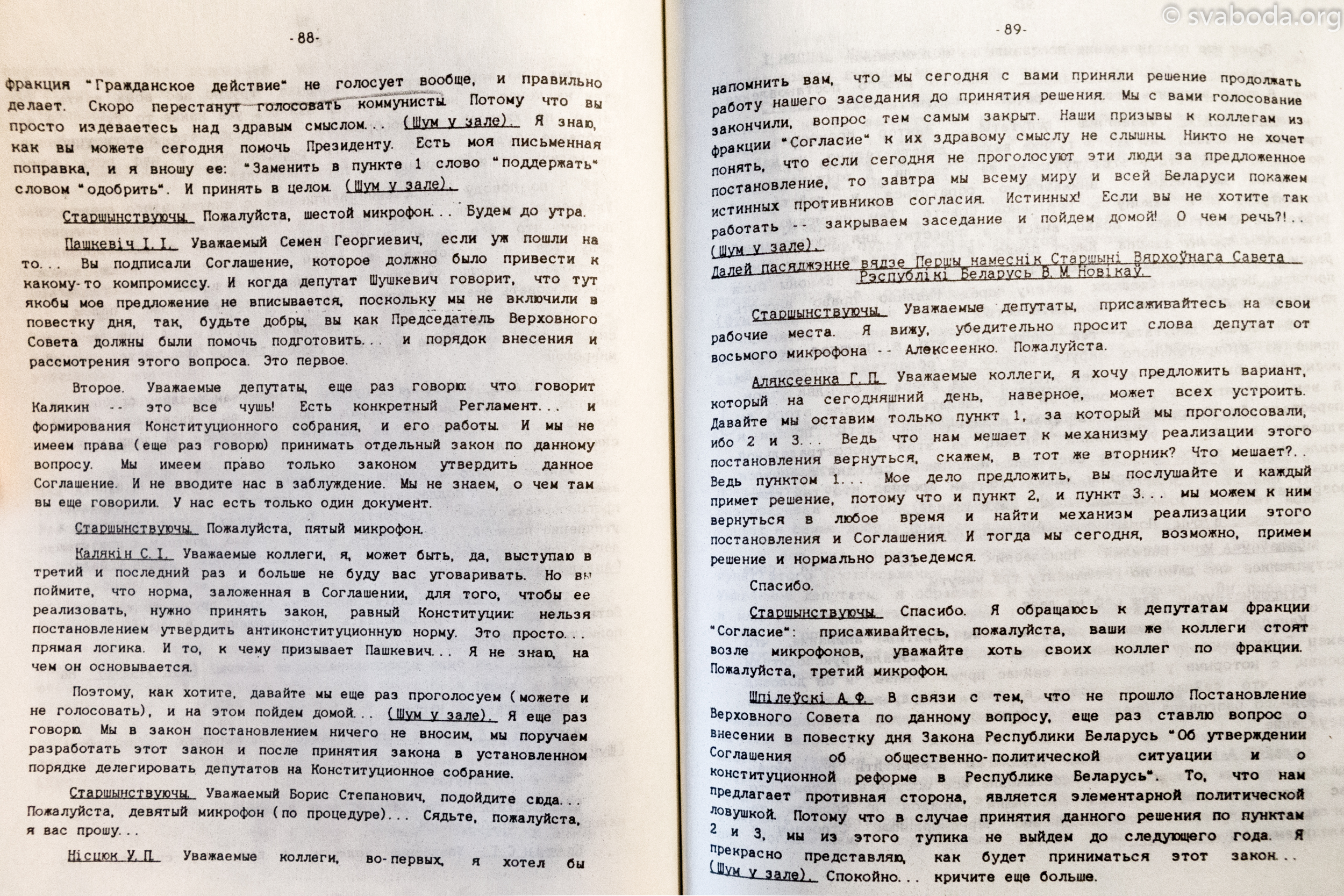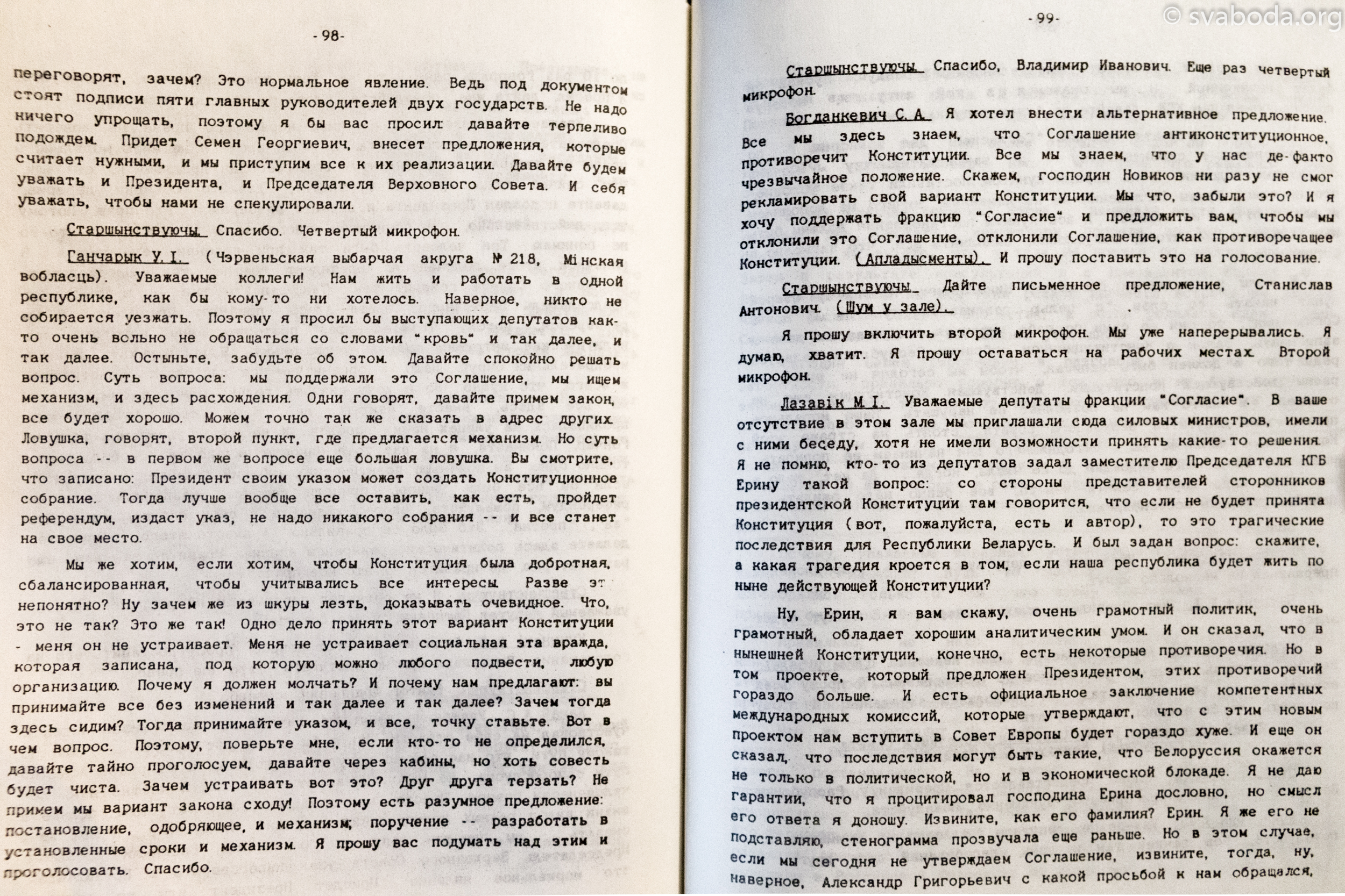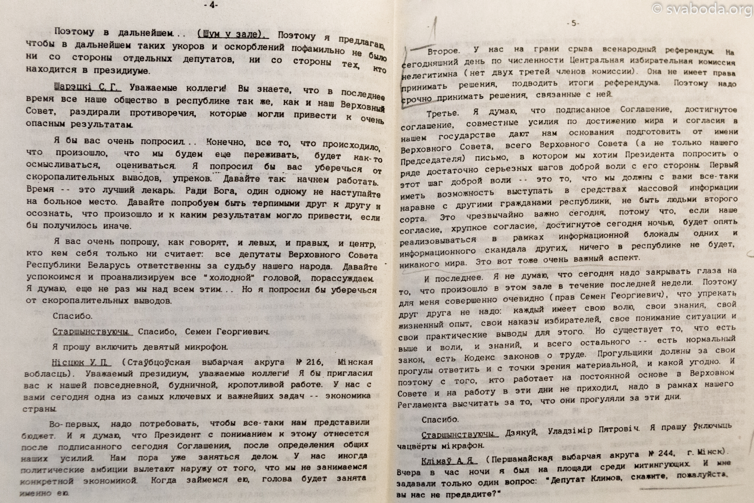 «Паважаны Сямён Георгіевіч, паважаныя дэпутаты. Я мабілізую ўсе сілы, каб быць спакойным і стрыманым. Я хацеў бы, каб Сямён Георгіевіч растлумачыў, чаму было падпісана зь яго боку такое пагадненьне?»