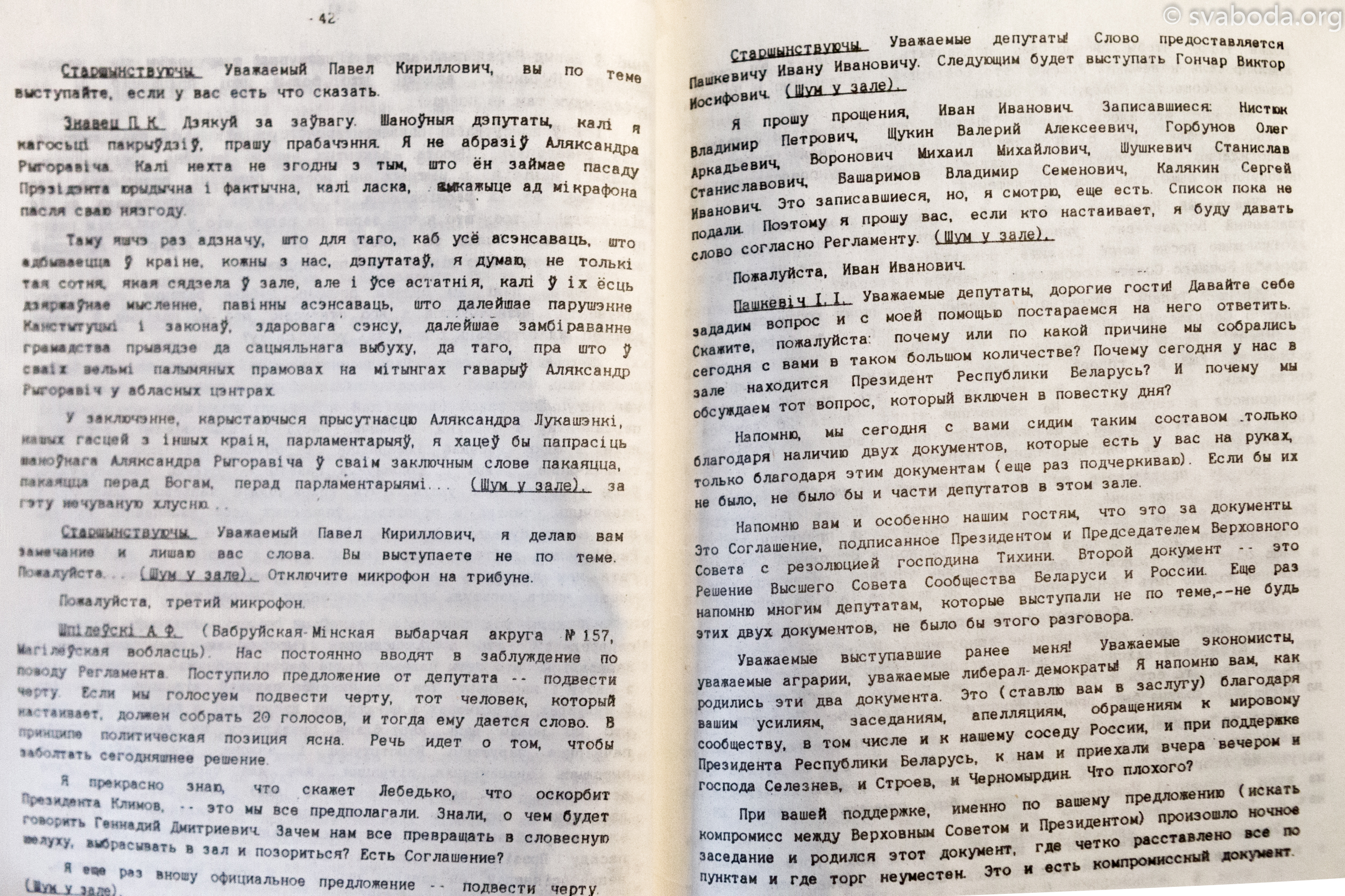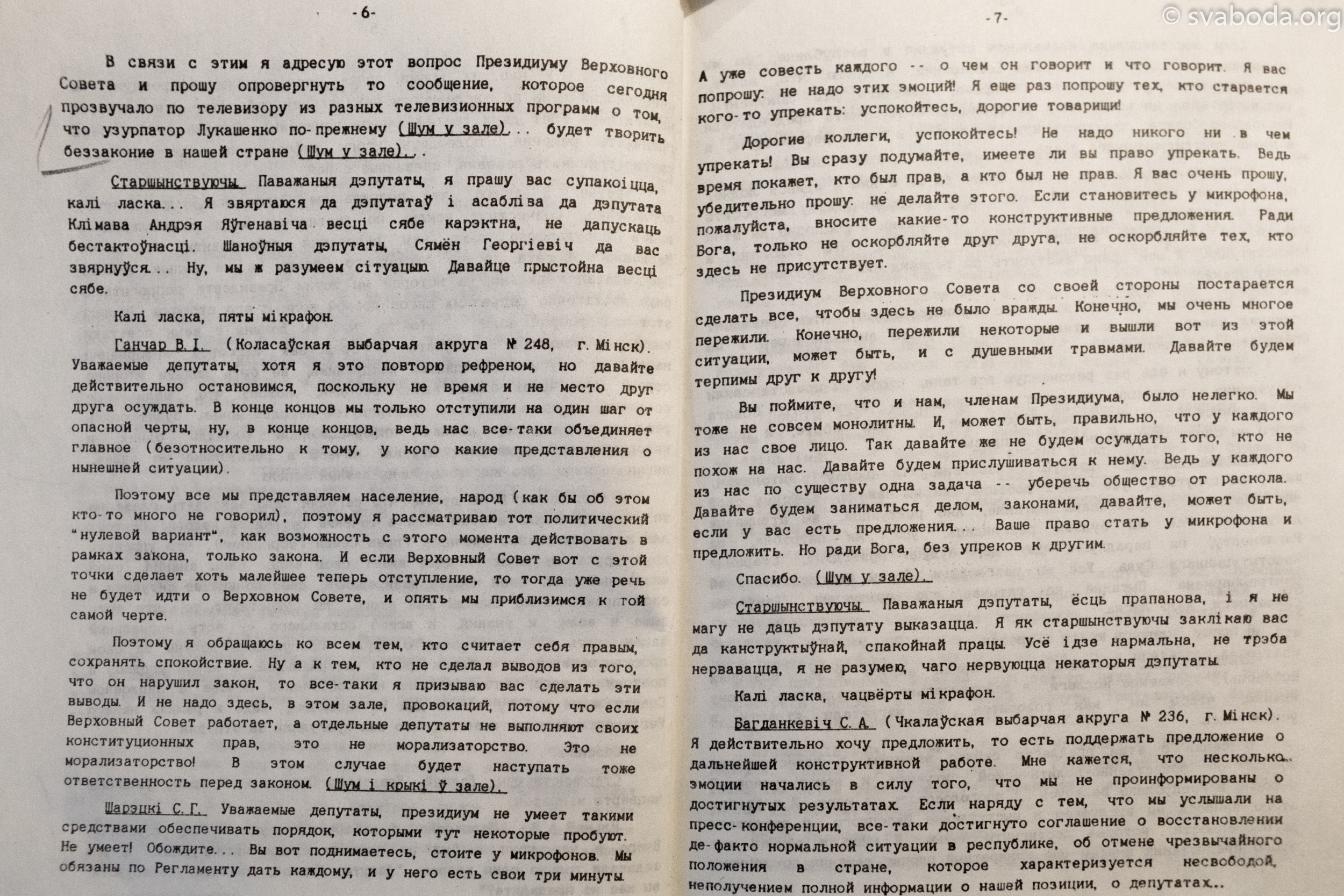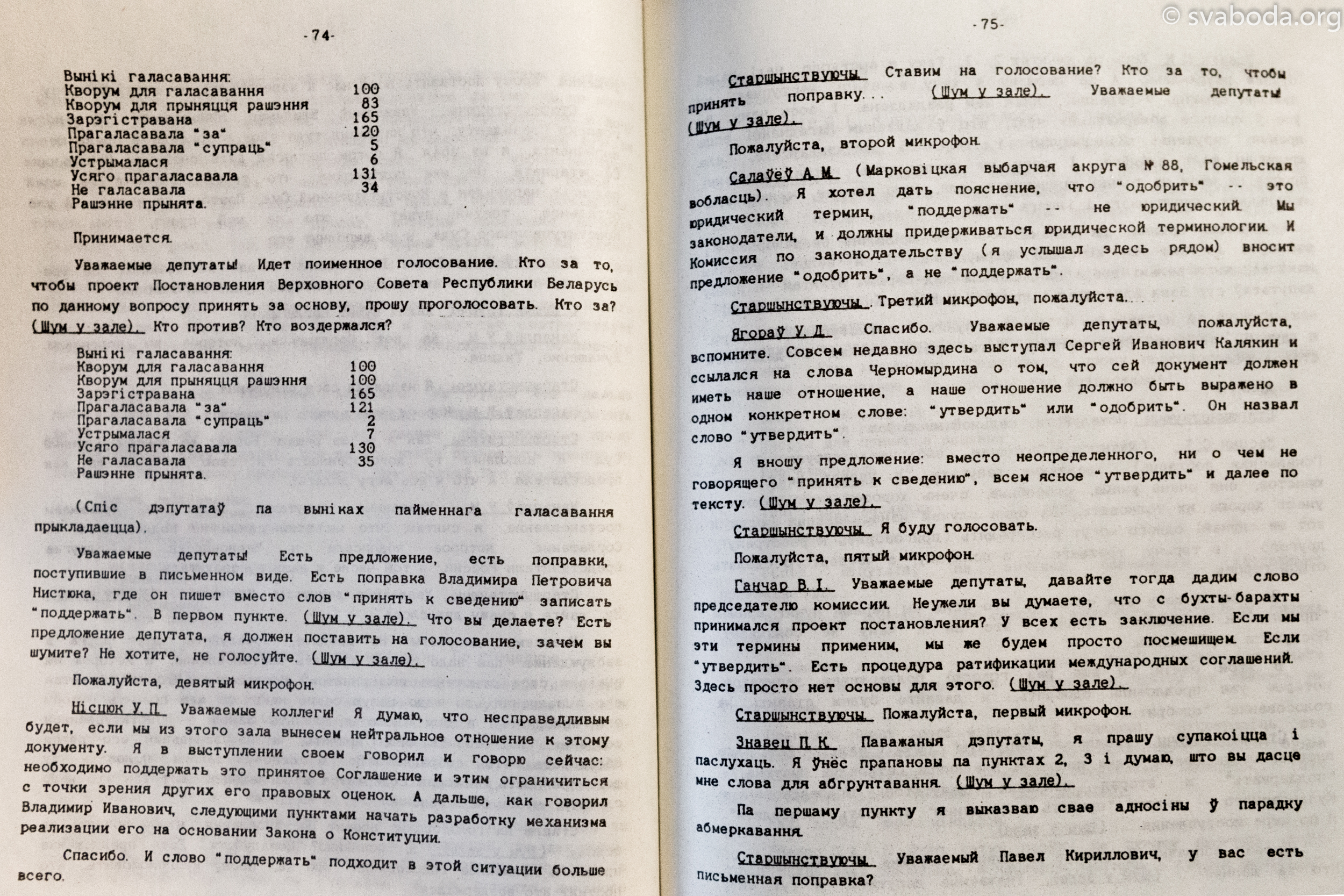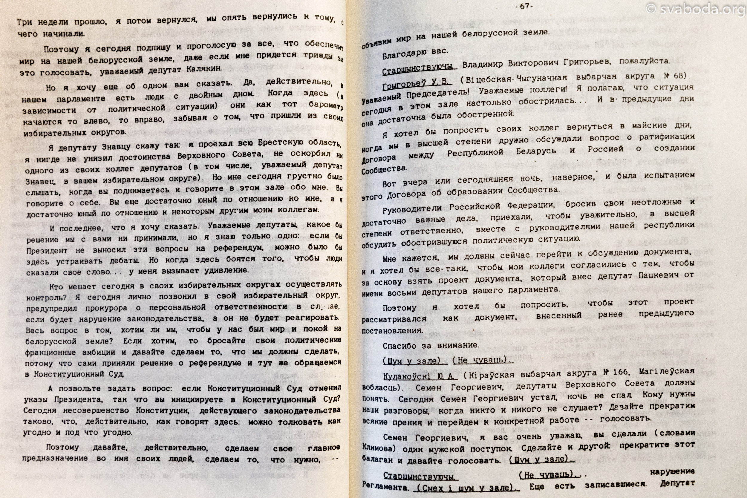 «Паважаны Сямён Георгіевіч, паважаныя дэпутаты. Я мабілізую ўсе сілы, каб быць спакойным і стрыманым. Я хацеў бы, каб Сямён Георгіевіч растлумачыў, чаму было падпісана зь яго боку такое пагадненьне?»