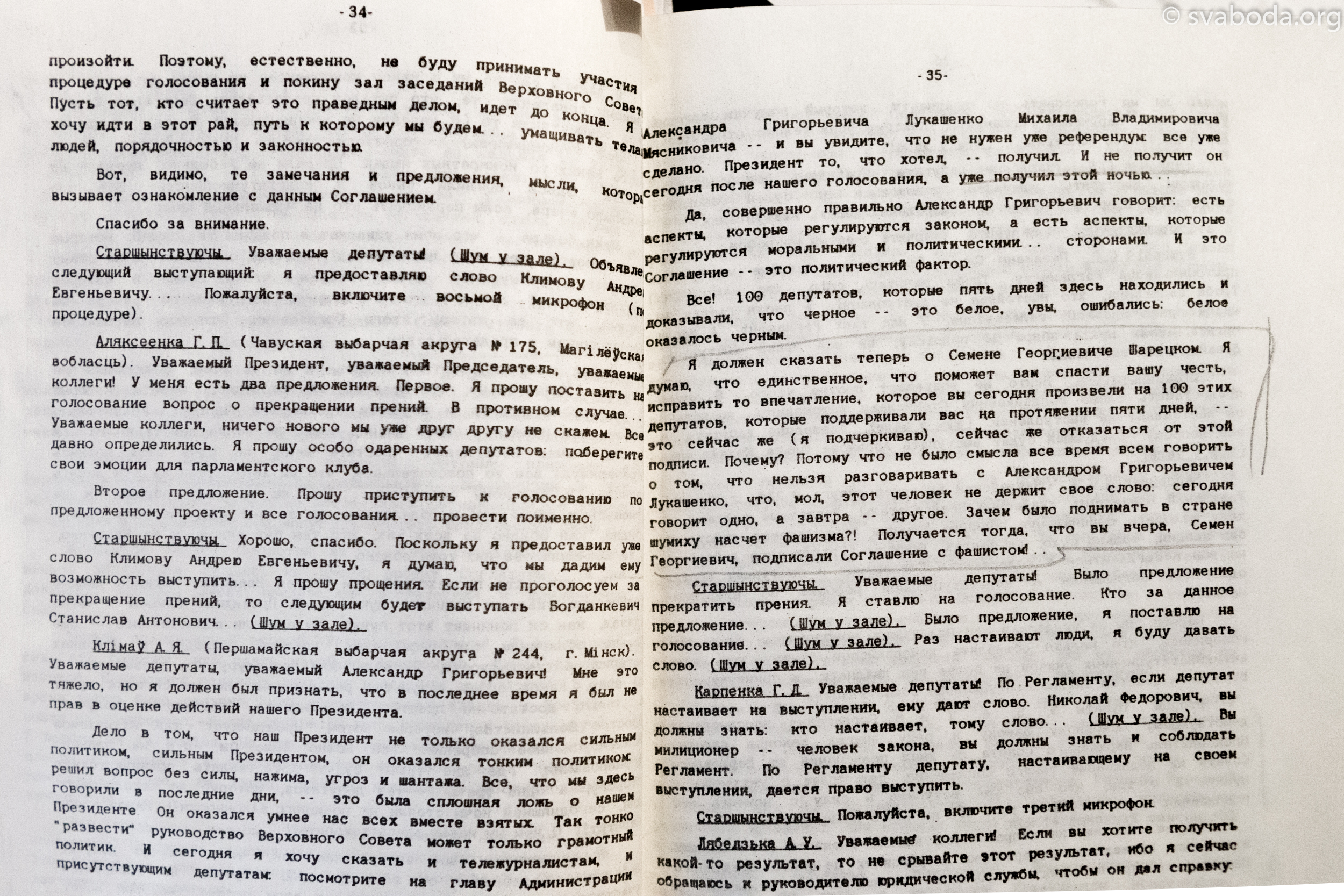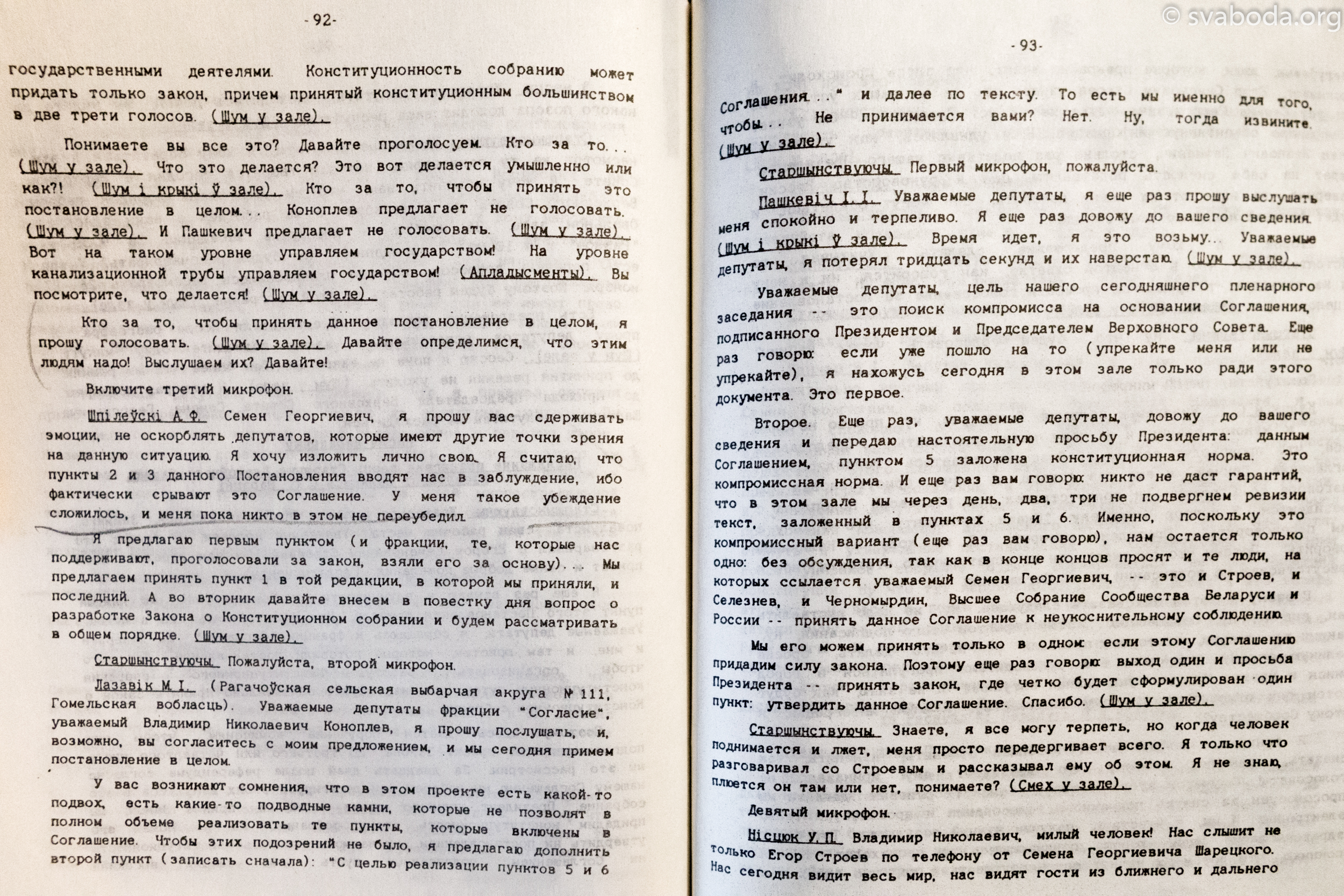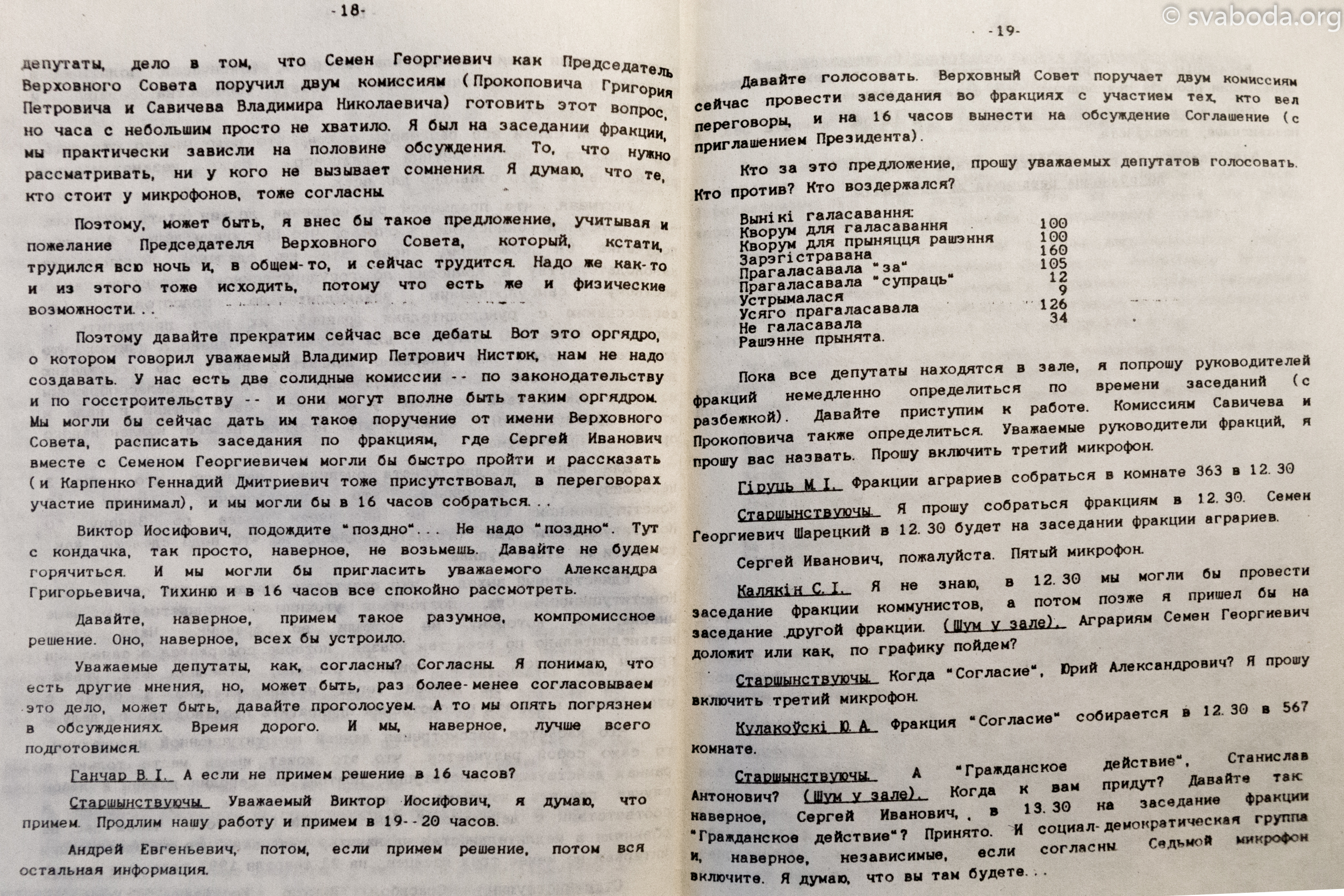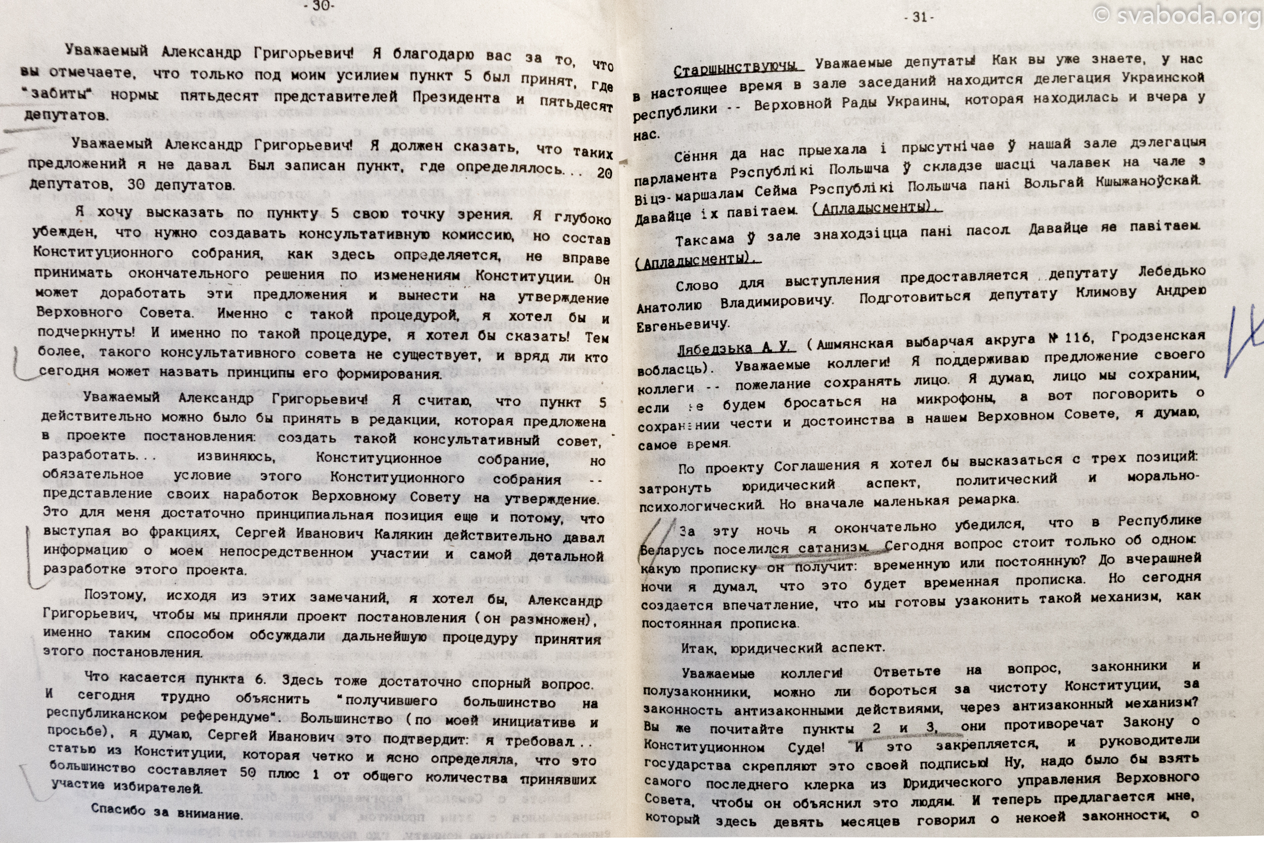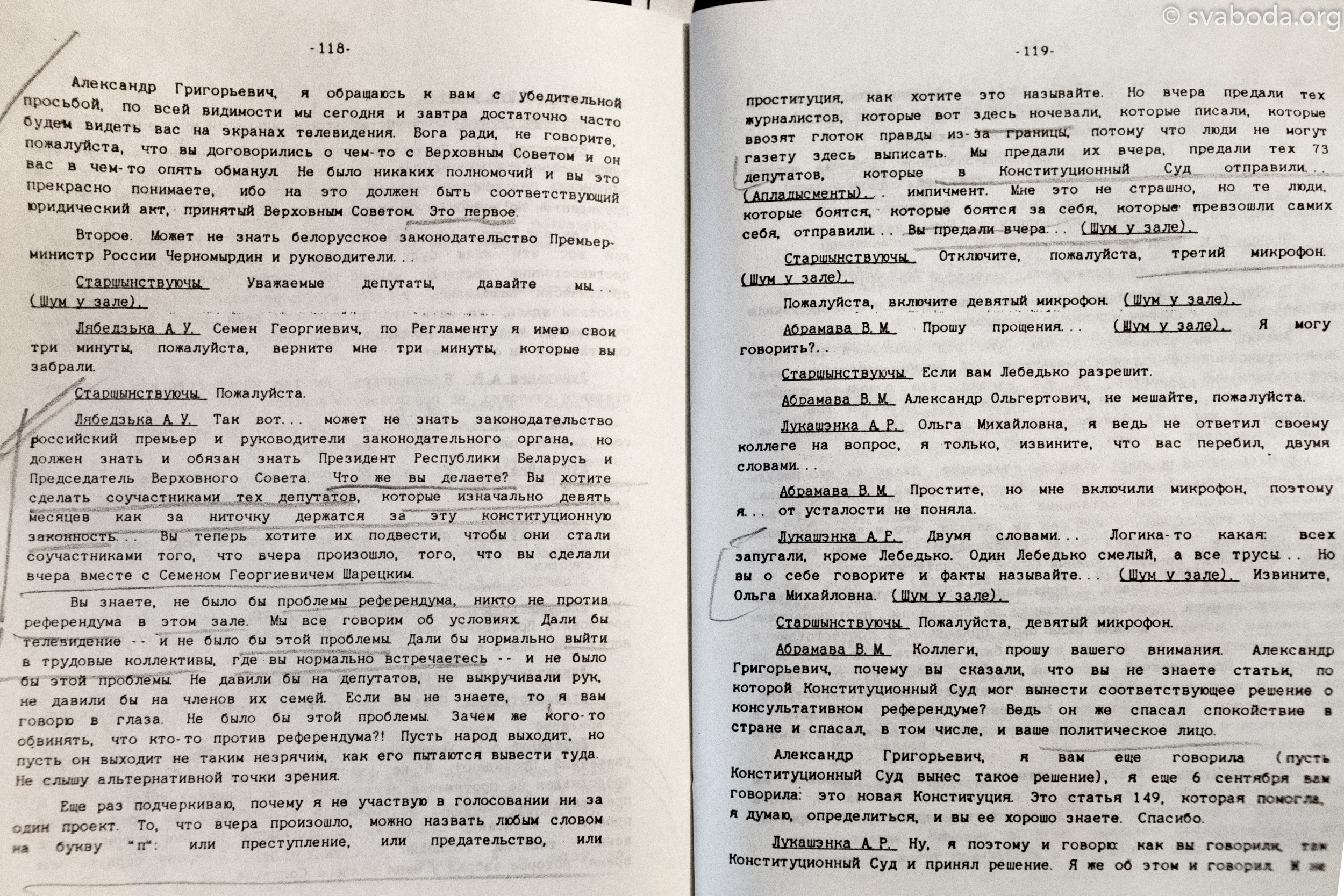 «Паважаны Сямён Георгіевіч, паважаныя дэпутаты. Я мабілізую ўсе сілы, каб быць спакойным і стрыманым. Я хацеў бы, каб Сямён Георгіевіч растлумачыў, чаму было падпісана зь яго боку такое пагадненьне?»