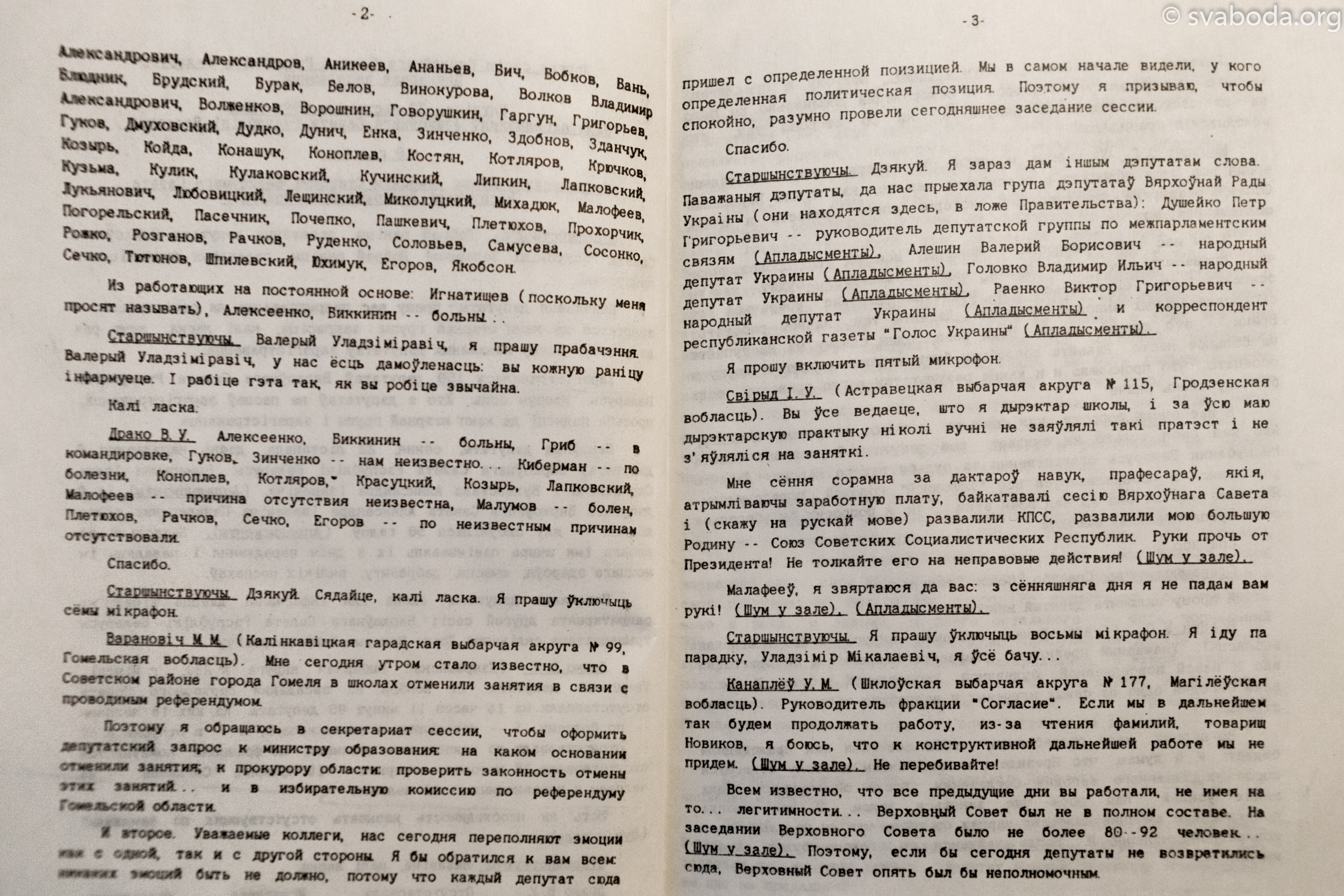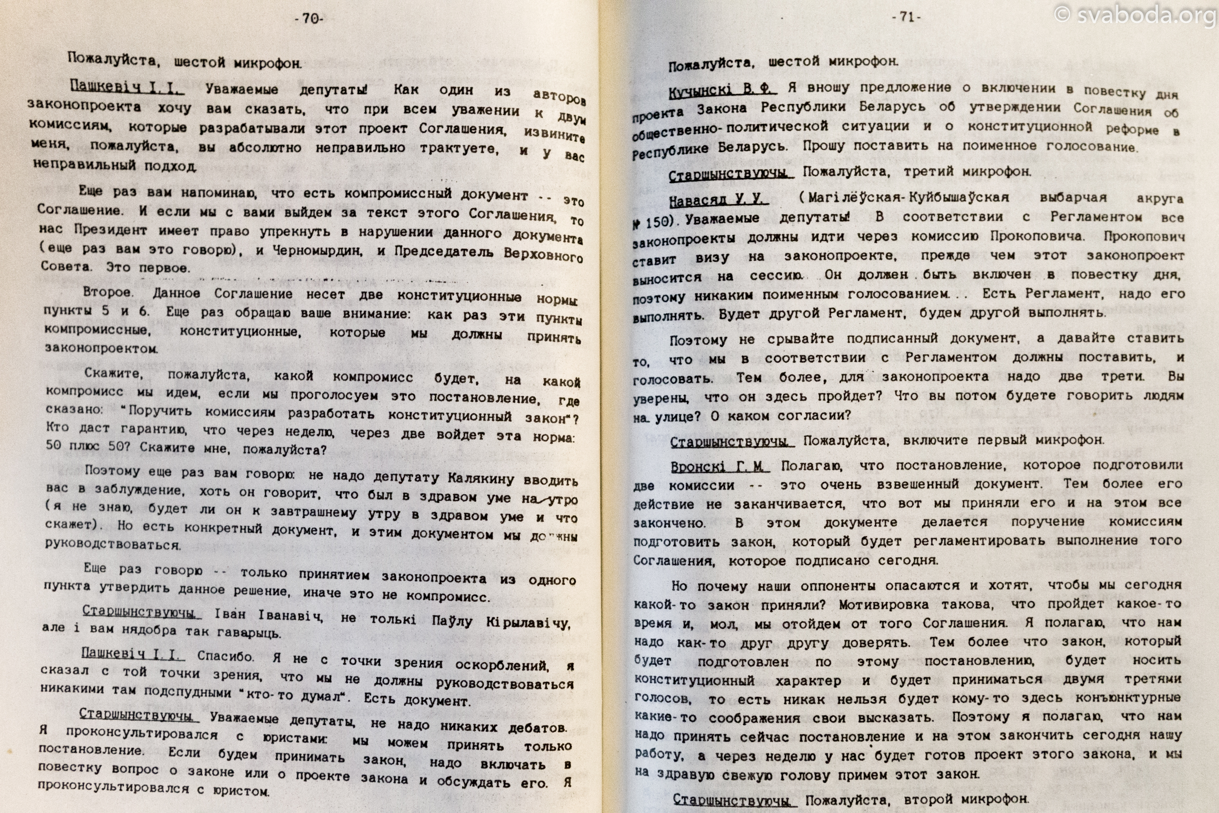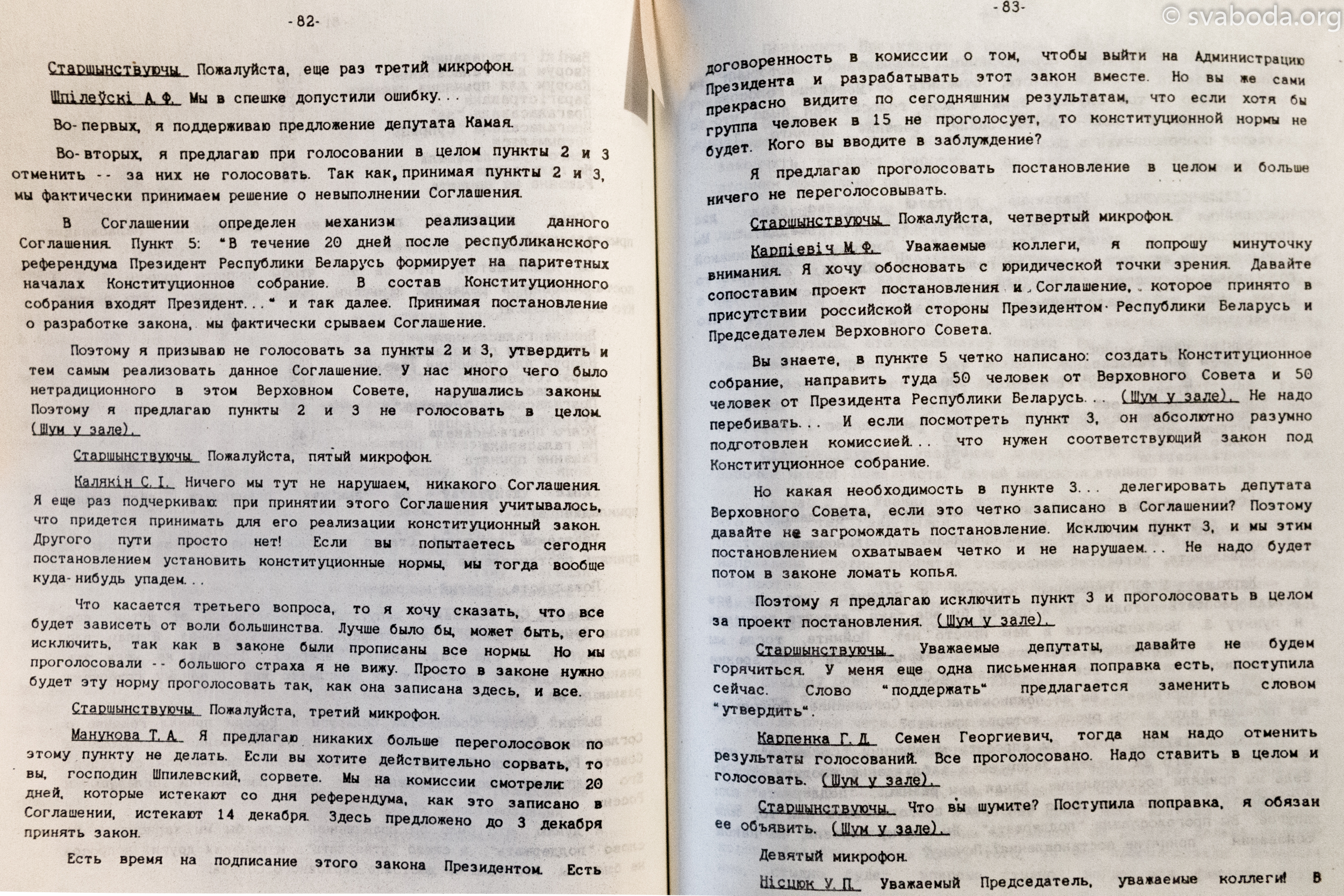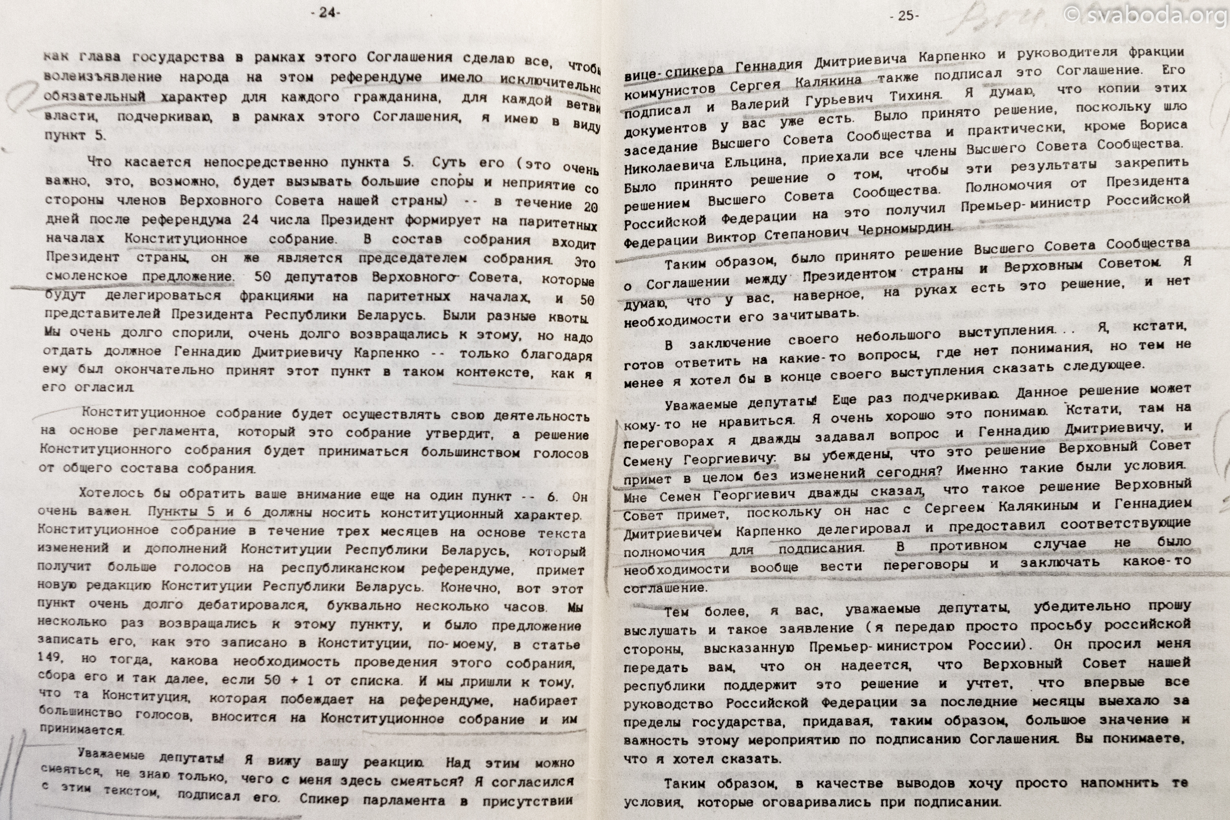 «Паважаны Сямён Георгіевіч, паважаныя дэпутаты. Я мабілізую ўсе сілы, каб быць спакойным і стрыманым. Я хацеў бы, каб Сямён Георгіевіч растлумачыў, чаму было падпісана зь яго боку такое пагадненьне?»
