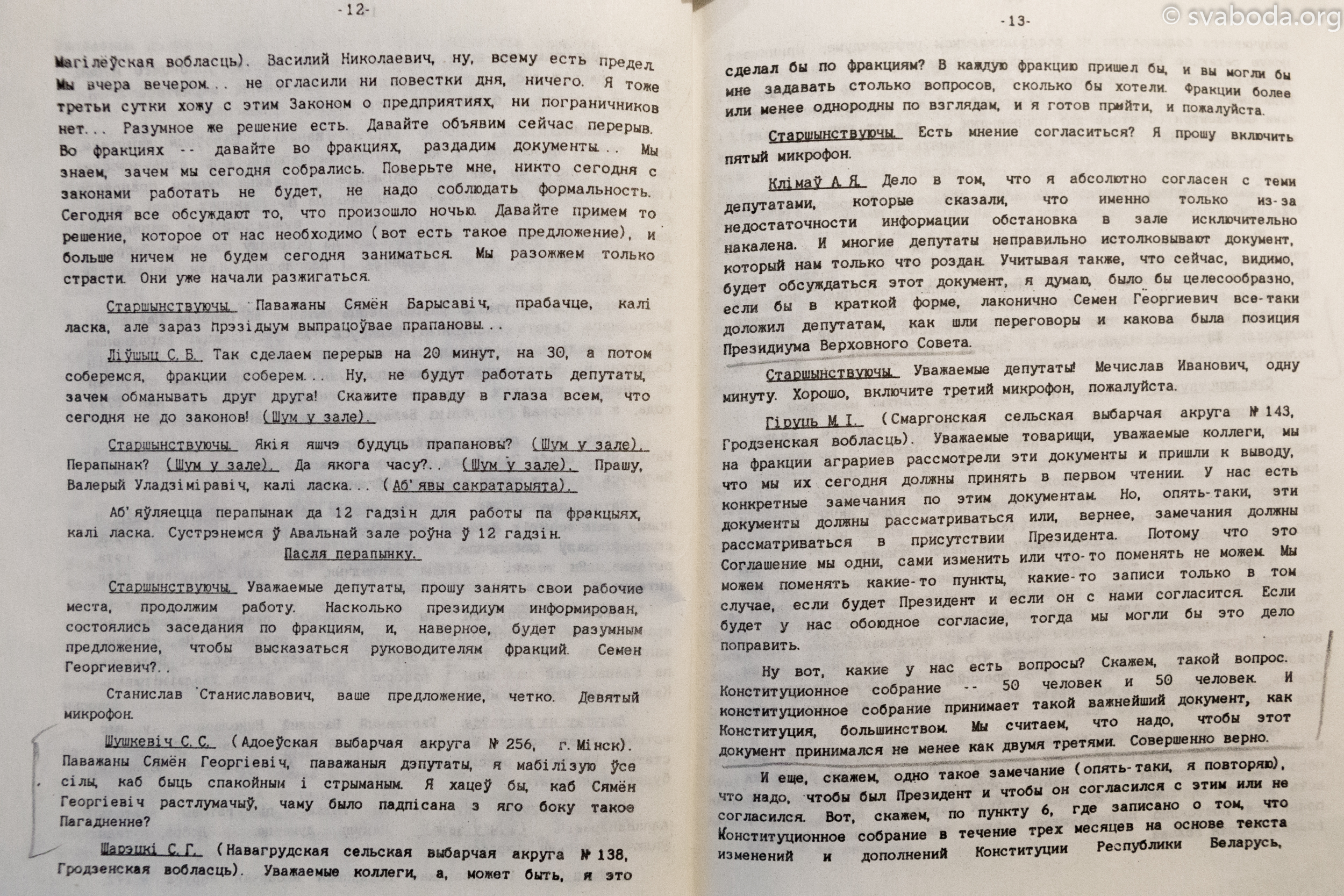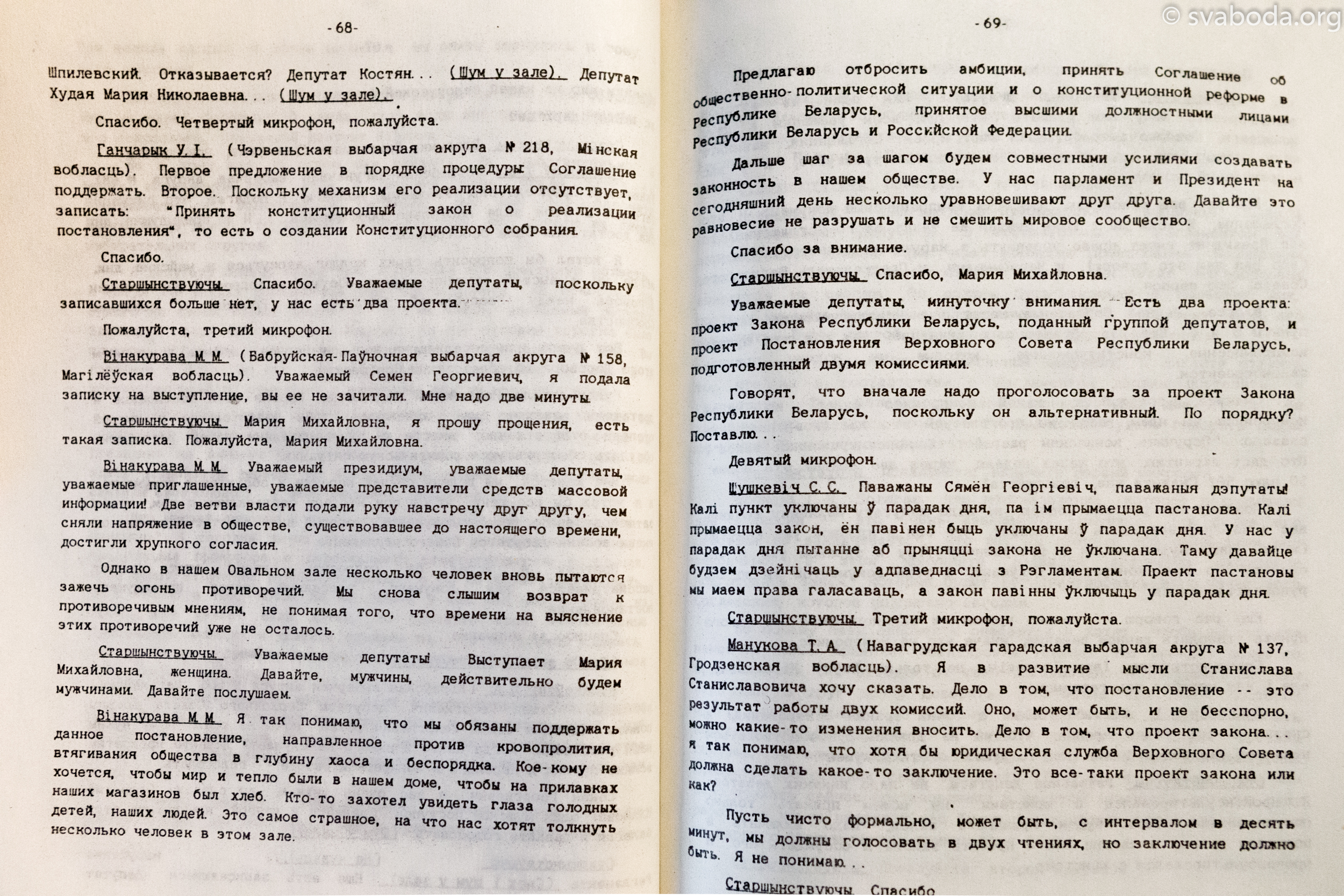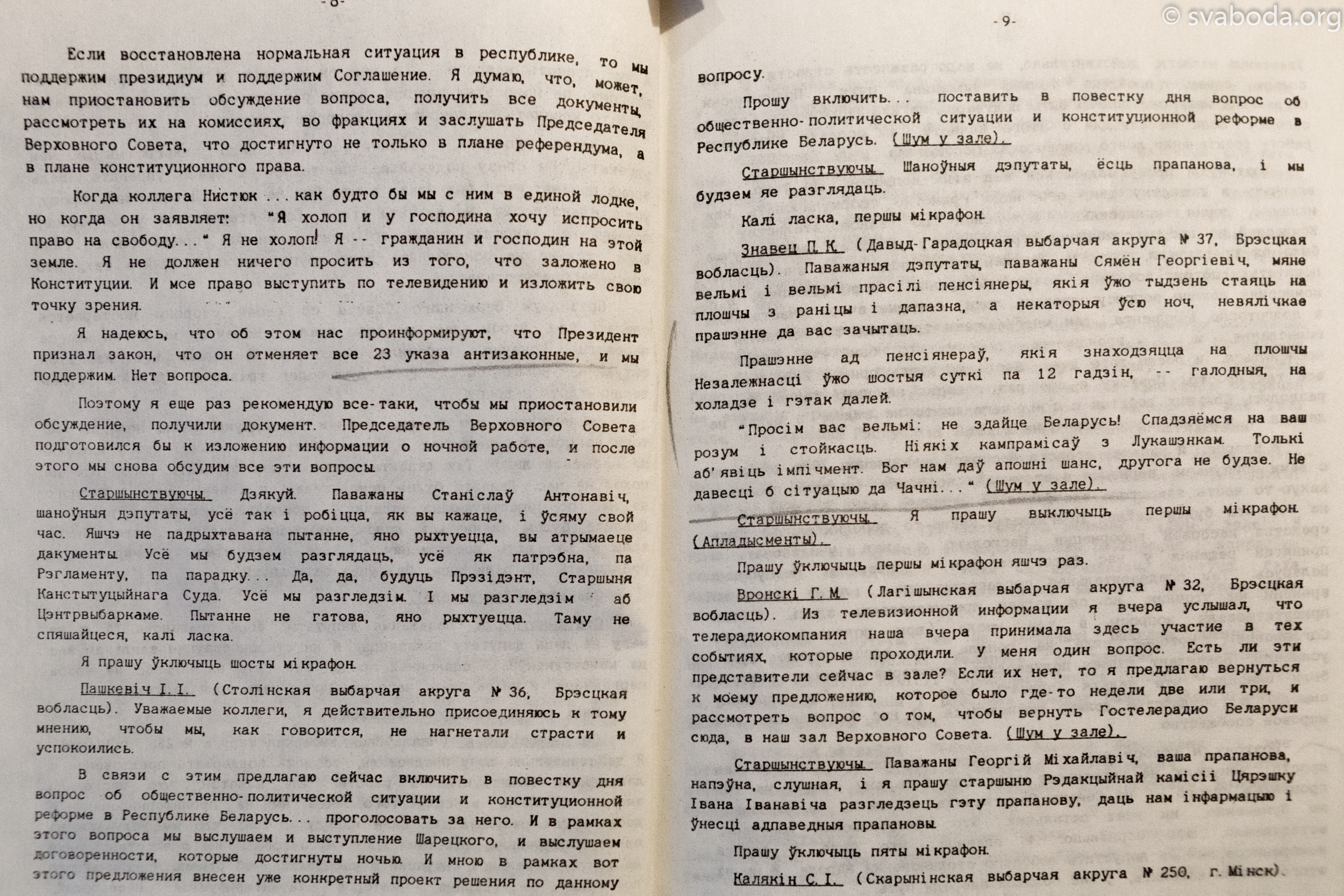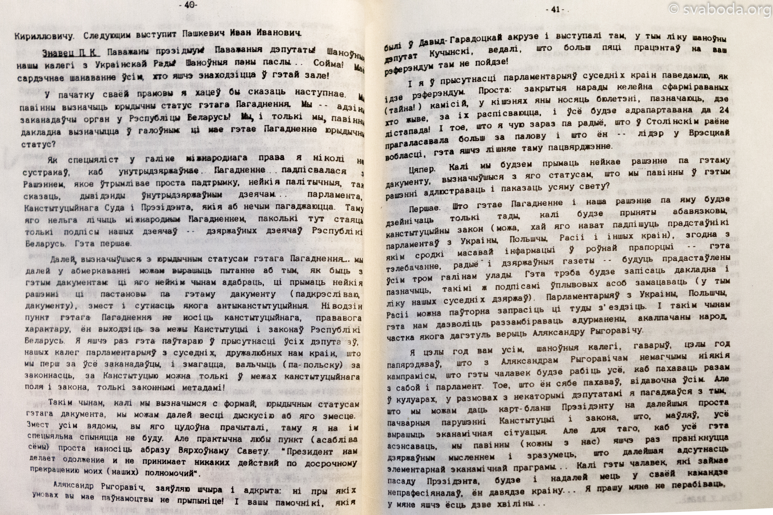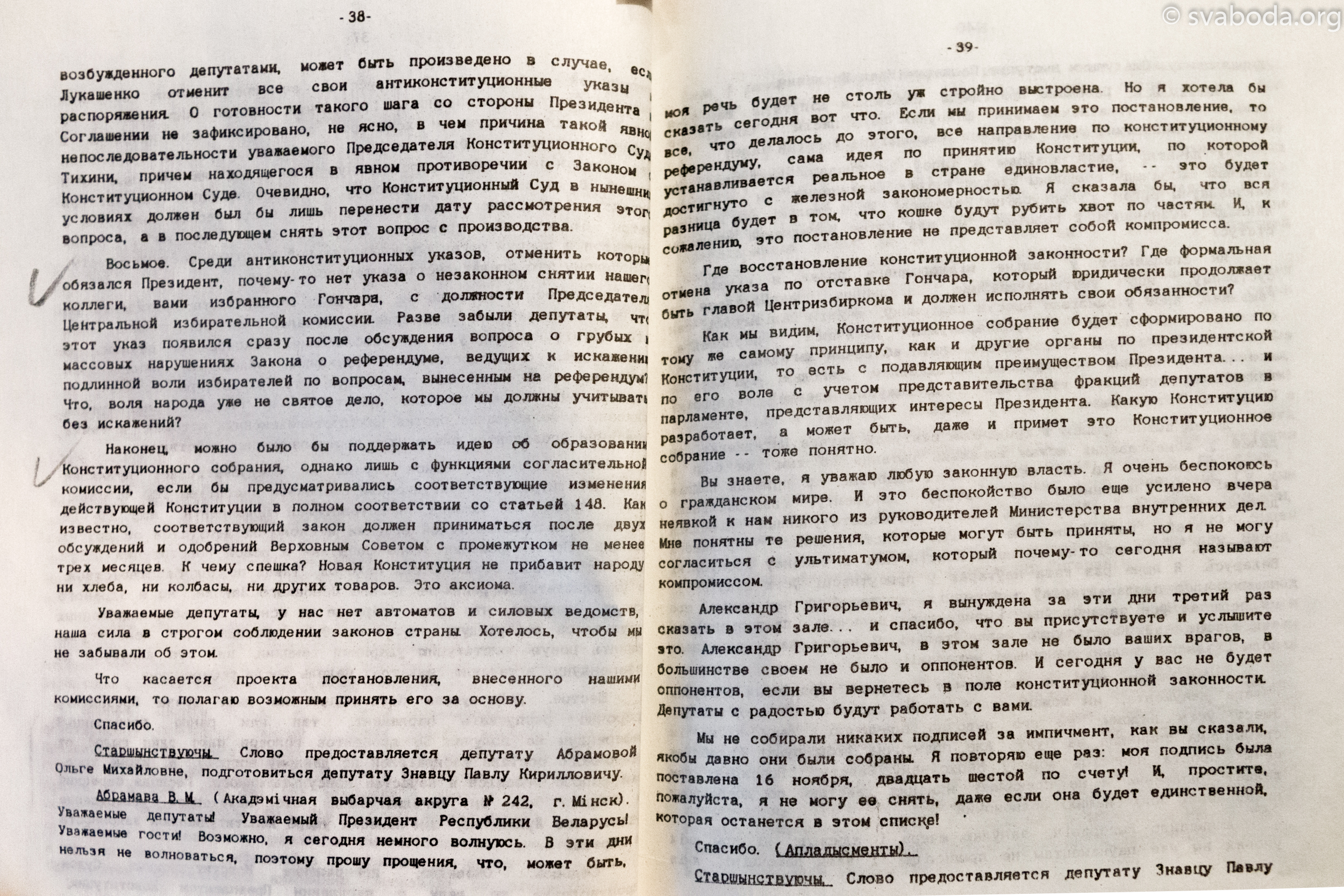 «Паважаны Сямён Георгіевіч, паважаныя дэпутаты. Я мабілізую ўсе сілы, каб быць спакойным і стрыманым. Я хацеў бы, каб Сямён Георгіевіч растлумачыў, чаму было падпісана зь яго боку такое пагадненьне?»