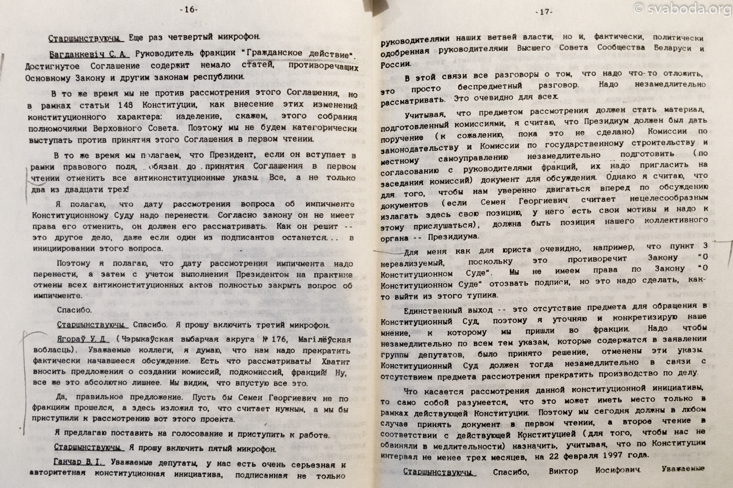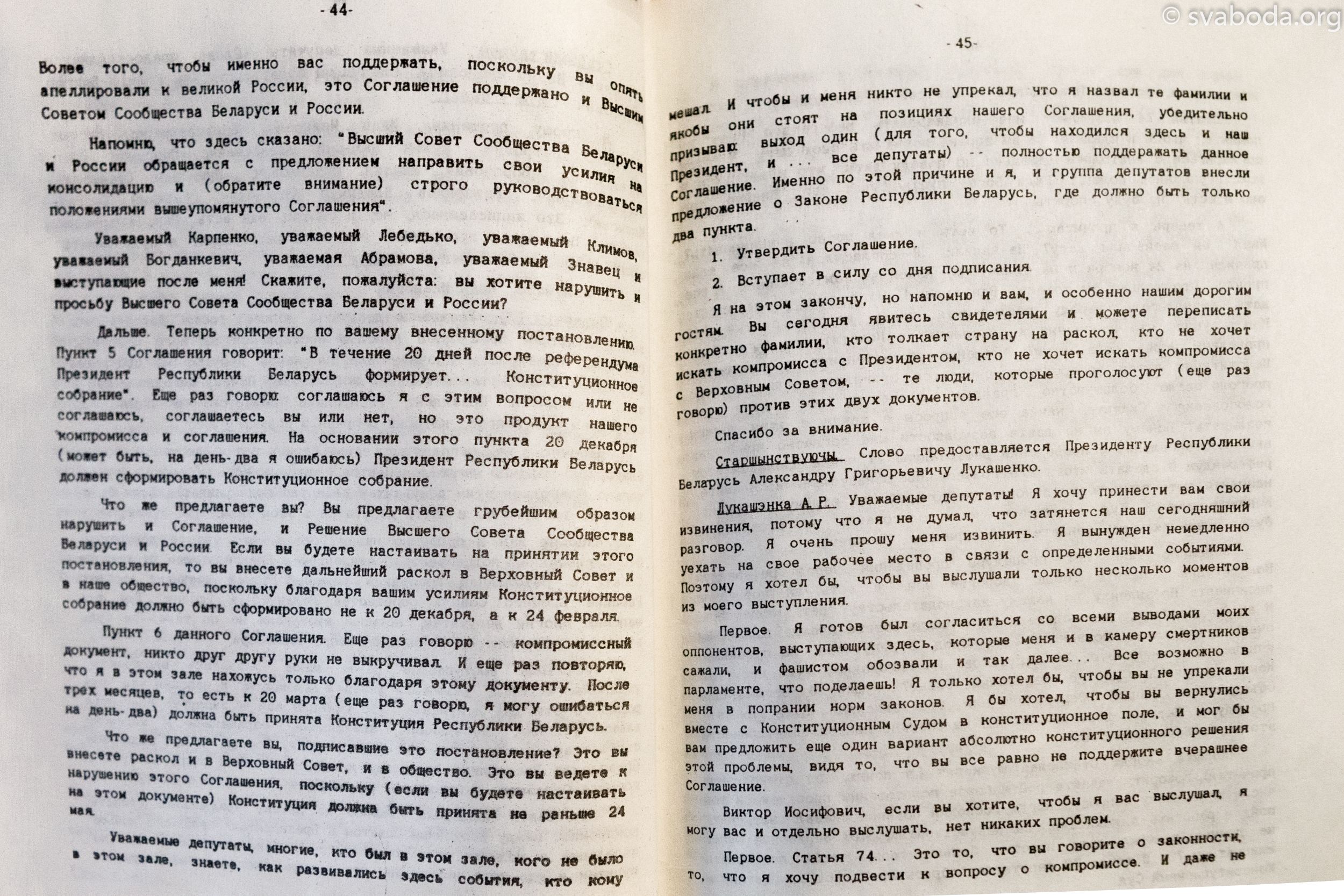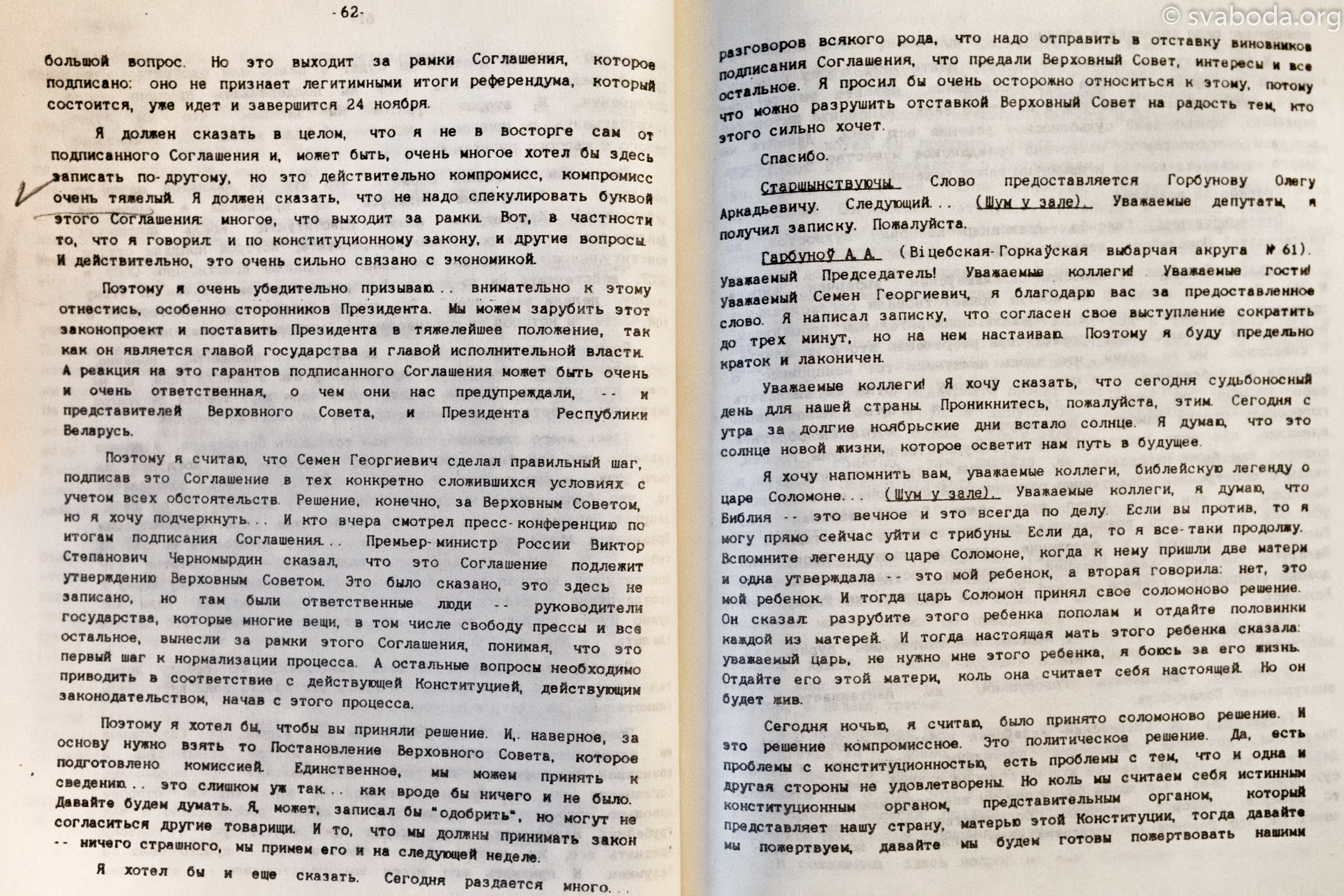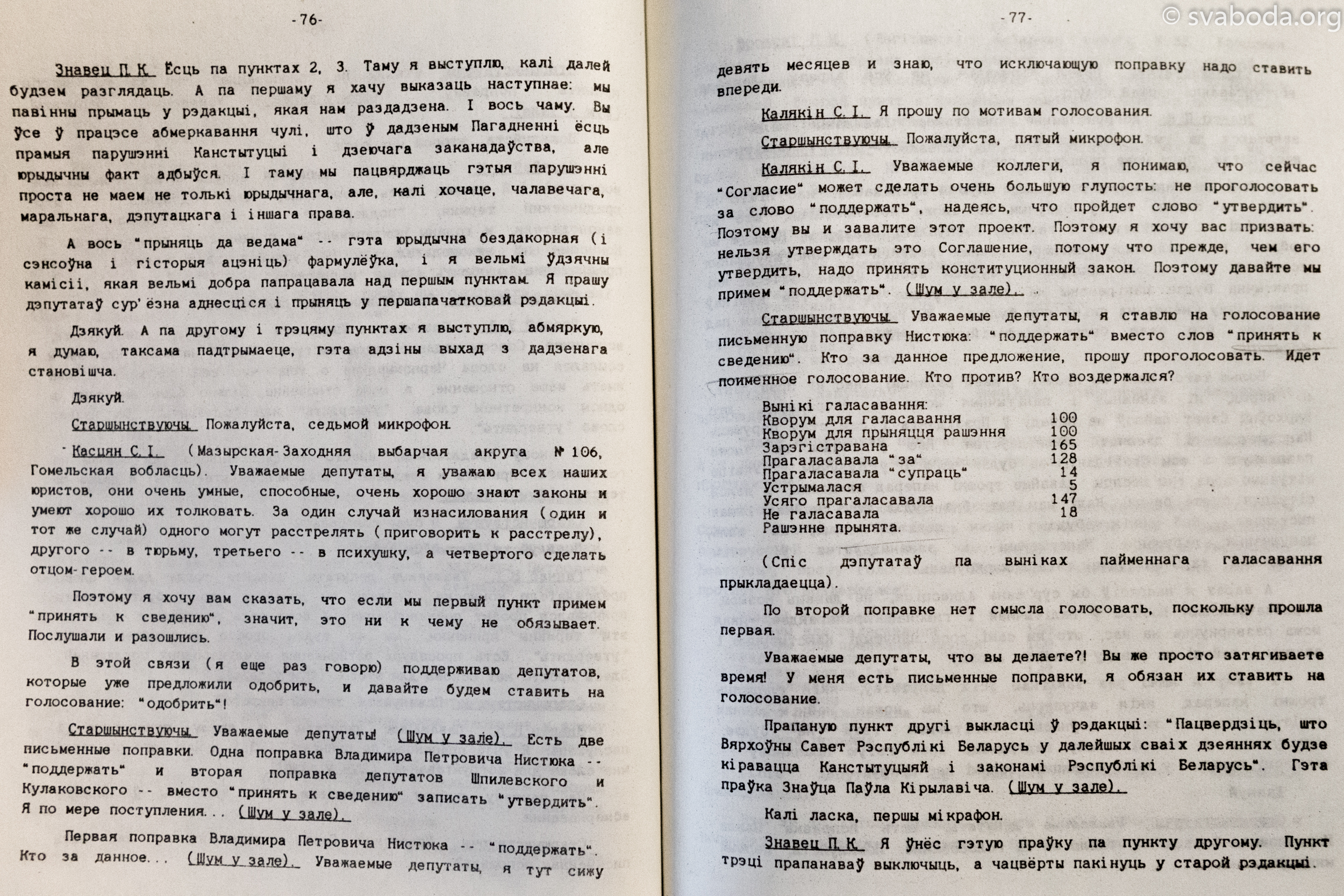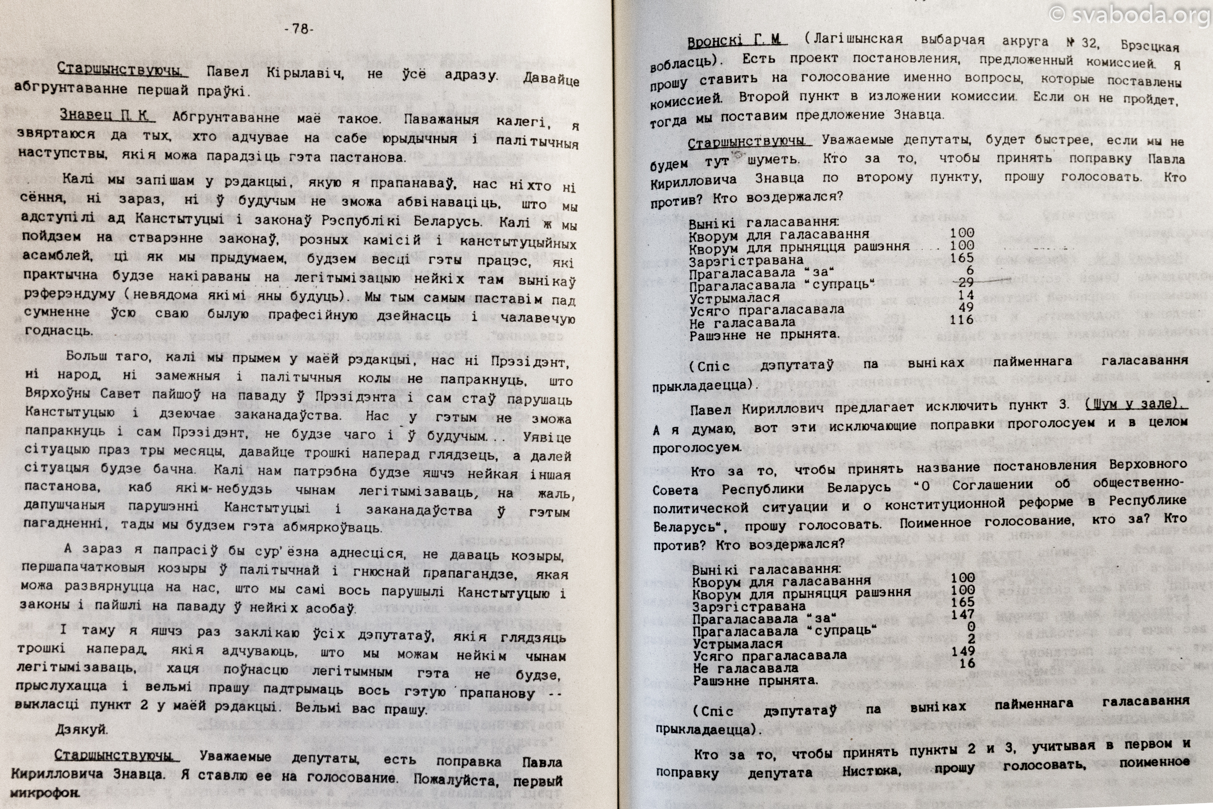«Паважаны Сямён Георгіевіч, паважаныя дэпутаты. Я мабілізую ўсе сілы, каб быць спакойным і стрыманым. Я хацеў бы, каб Сямён Георгіевіч растлумачыў, чаму было падпісана зь яго боку такое пагадненьне?»