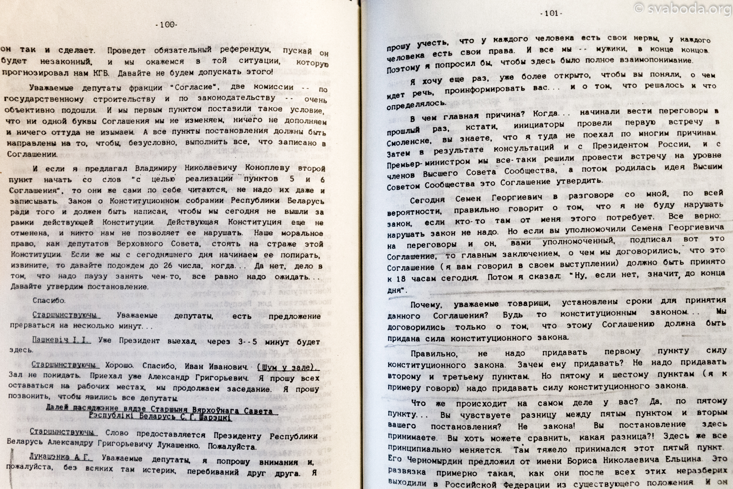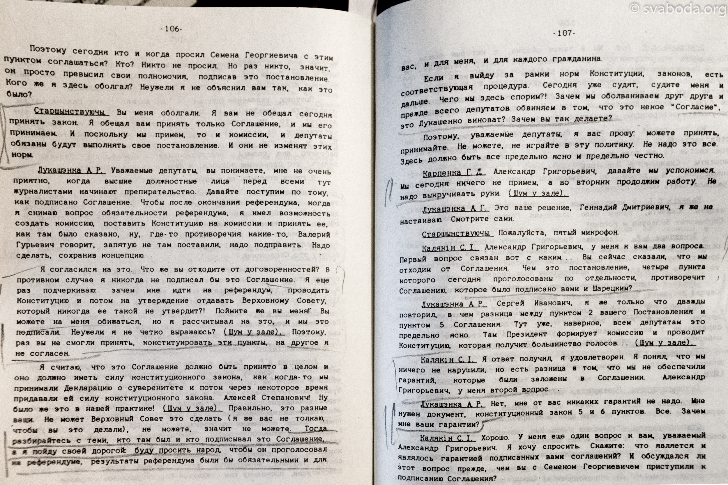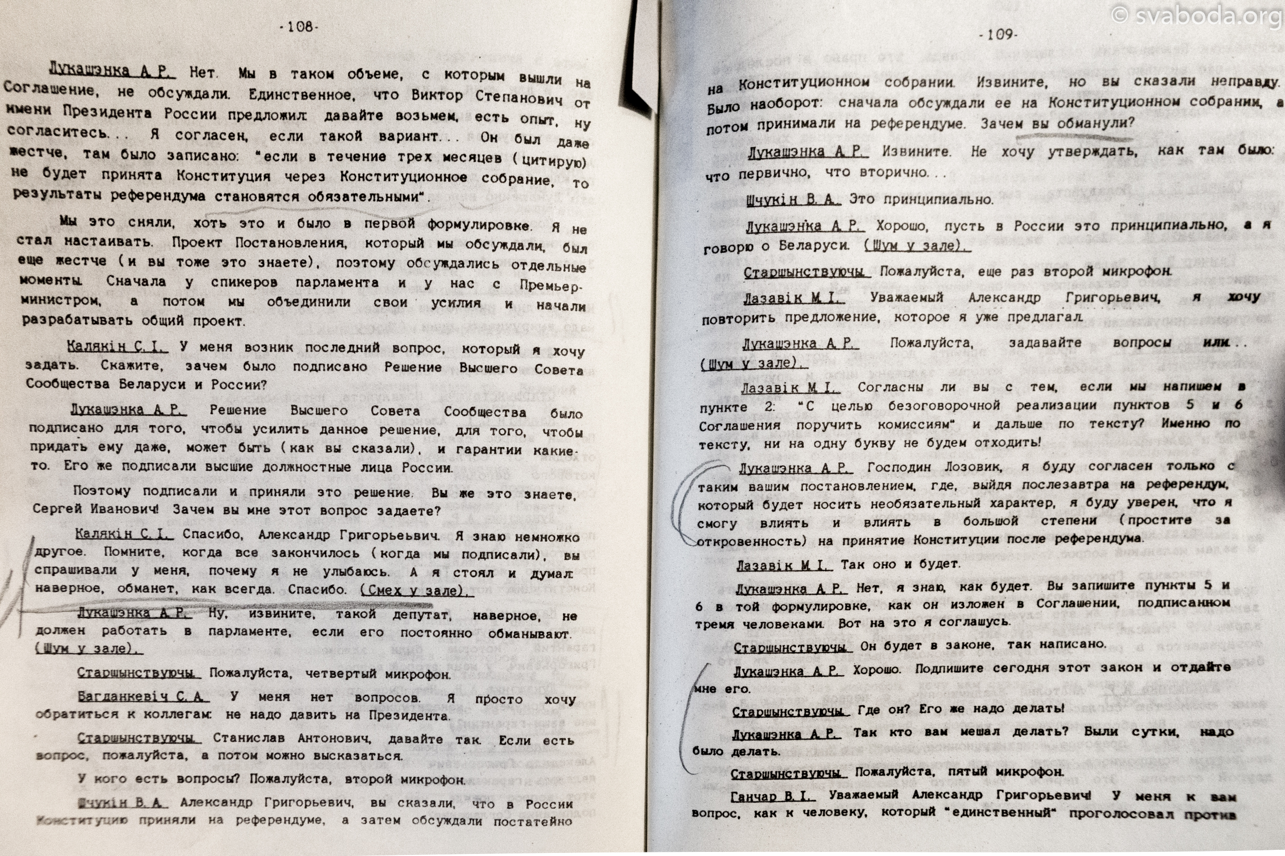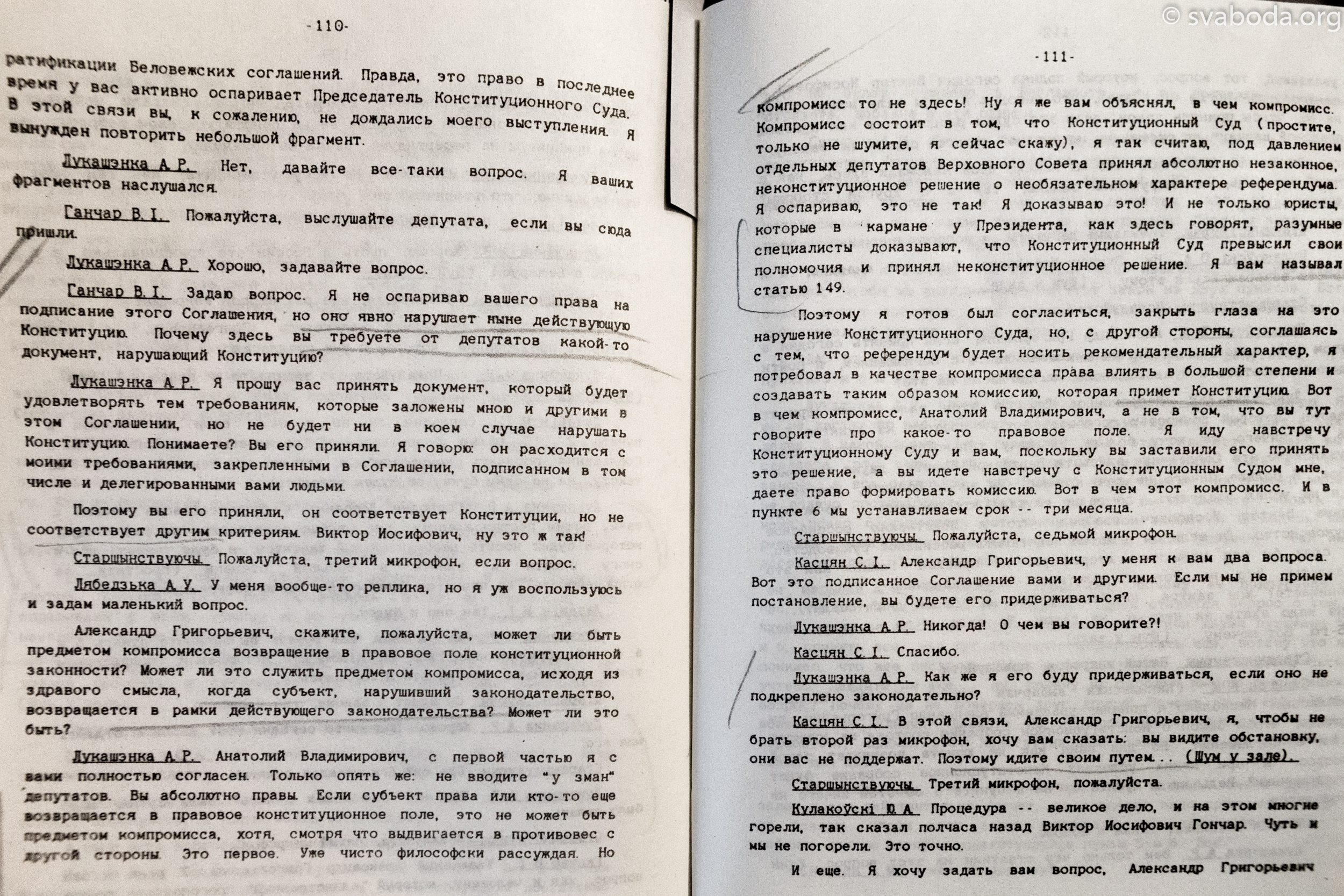 «Паважаны Сямён Георгіевіч, паважаныя дэпутаты. Я мабілізую ўсе сілы, каб быць спакойным і стрыманым. Я хацеў бы, каб Сямён Георгіевіч растлумачыў, чаму было падпісана зь яго боку такое пагадненьне?»