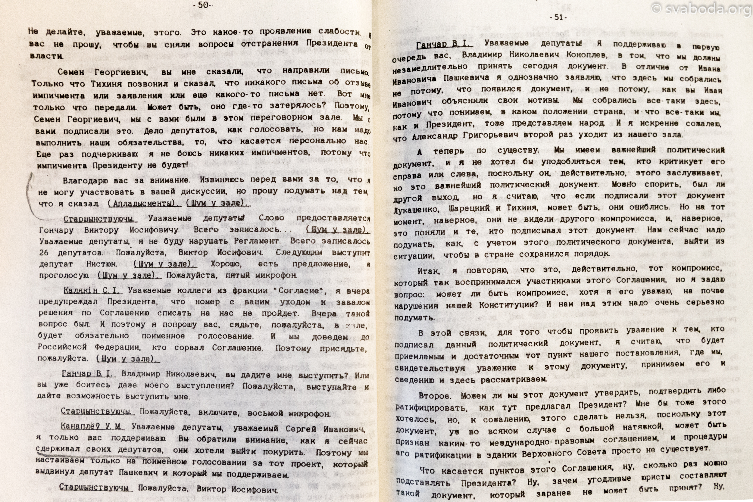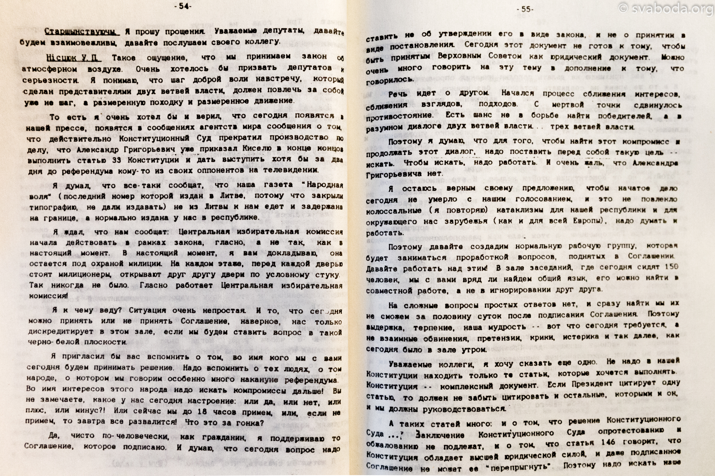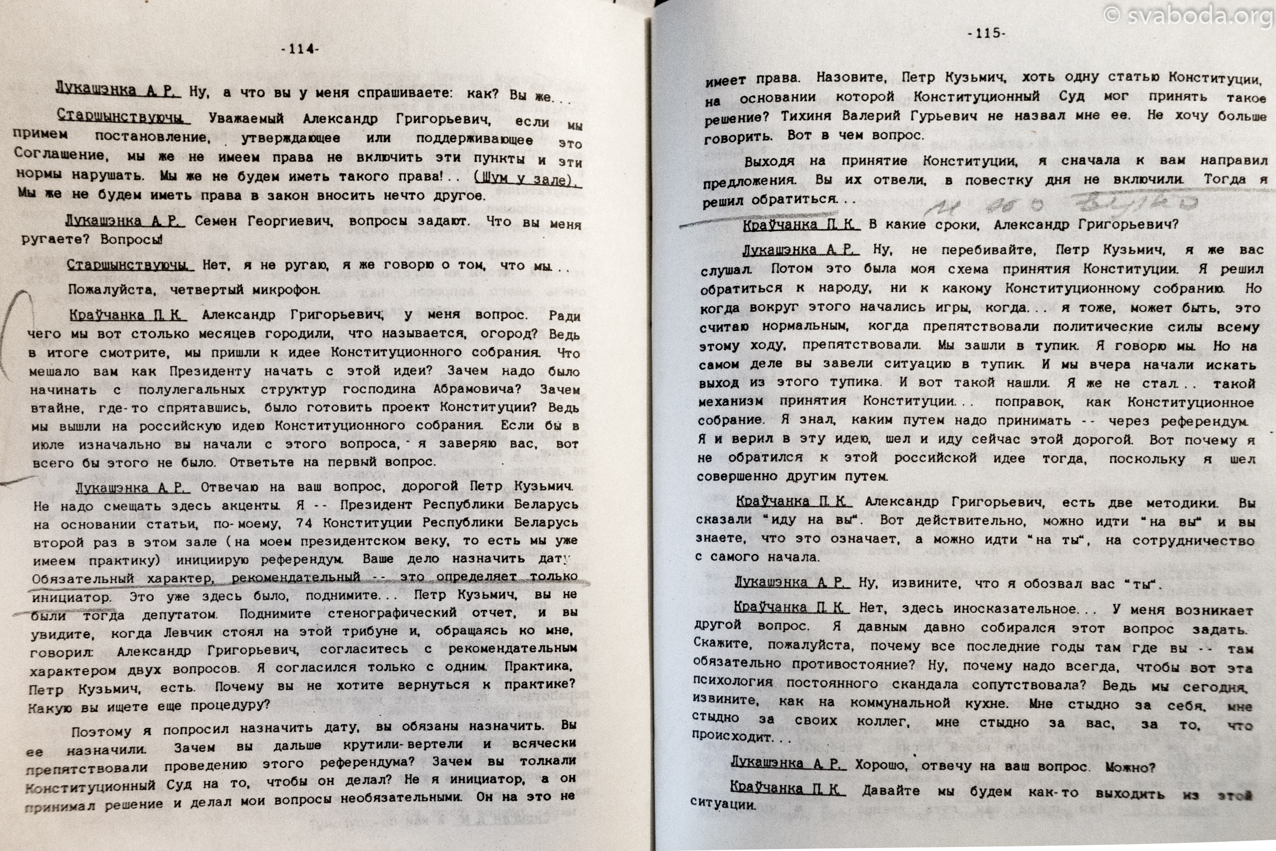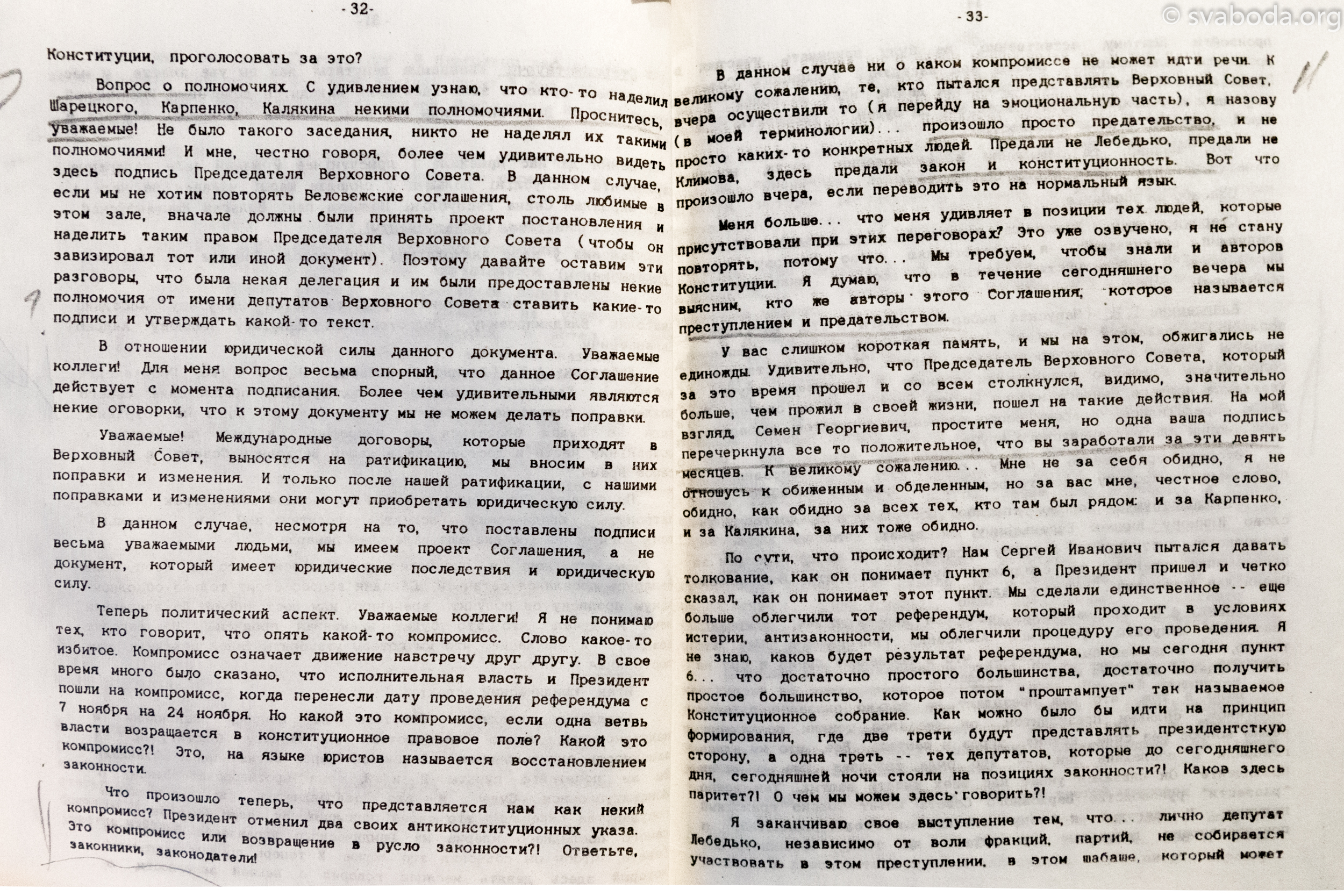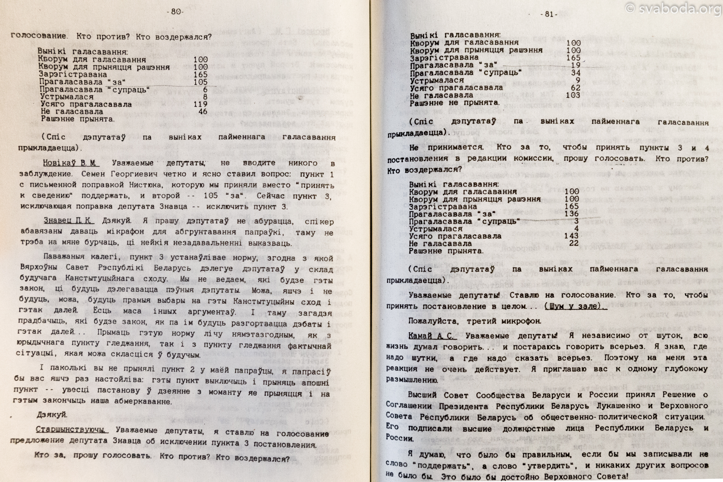 «Паважаны Сямён Георгіевіч, паважаныя дэпутаты. Я мабілізую ўсе сілы, каб быць спакойным і стрыманым. Я хацеў бы, каб Сямён Георгіевіч растлумачыў, чаму было падпісана зь яго боку такое пагадненьне?»