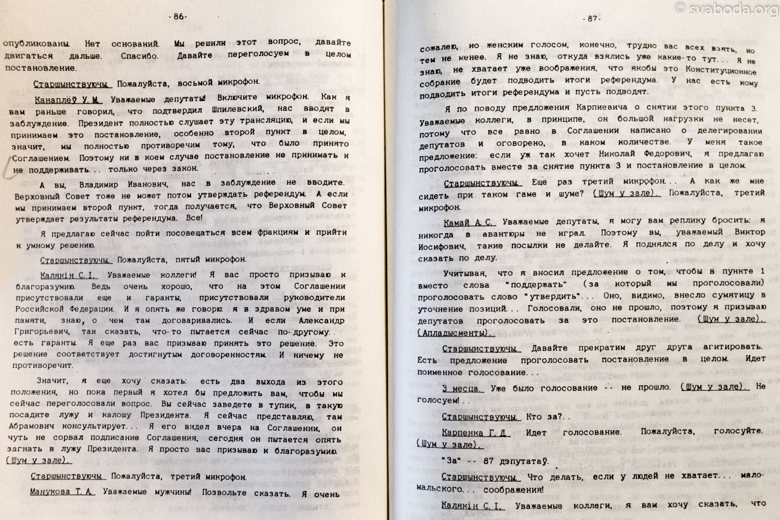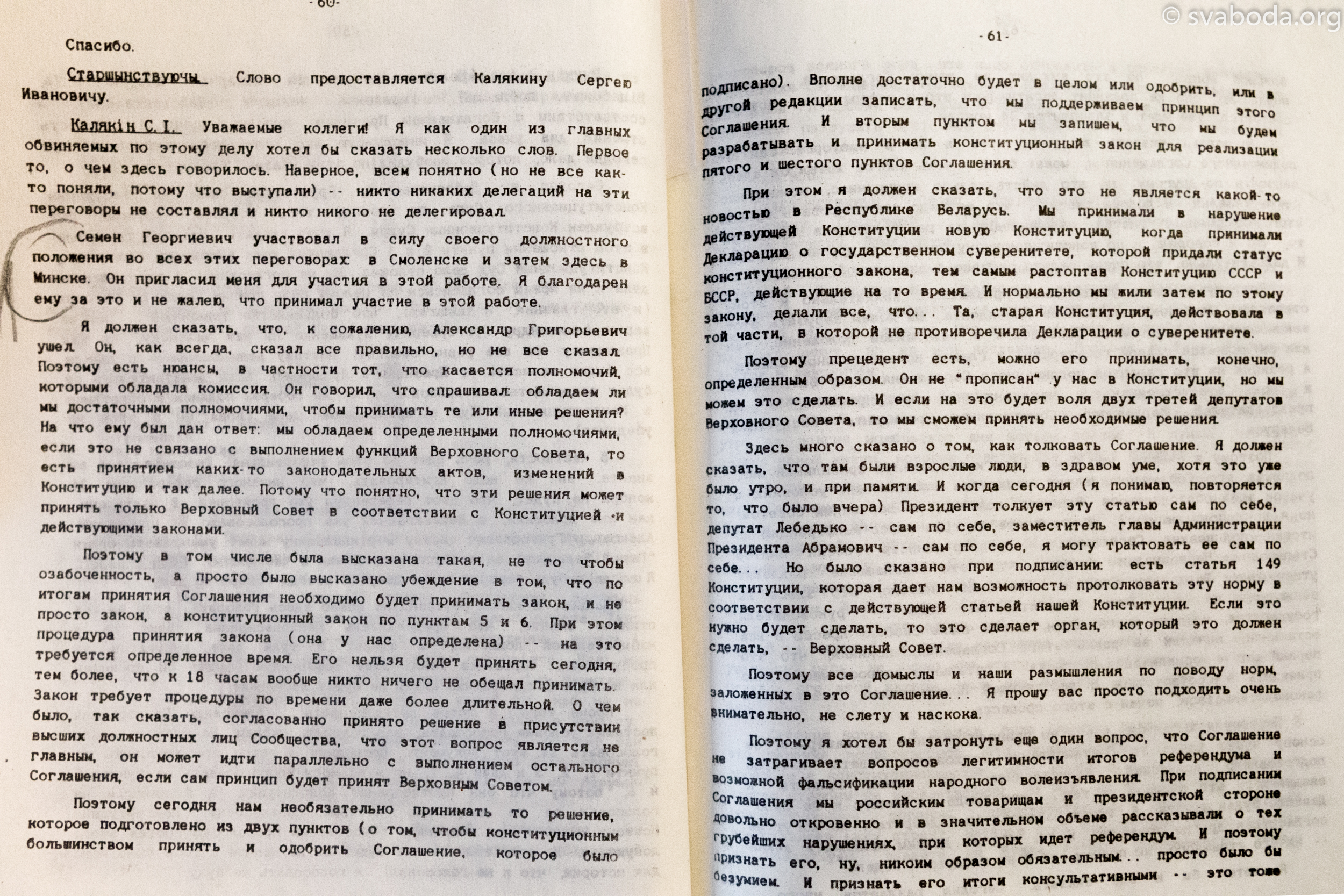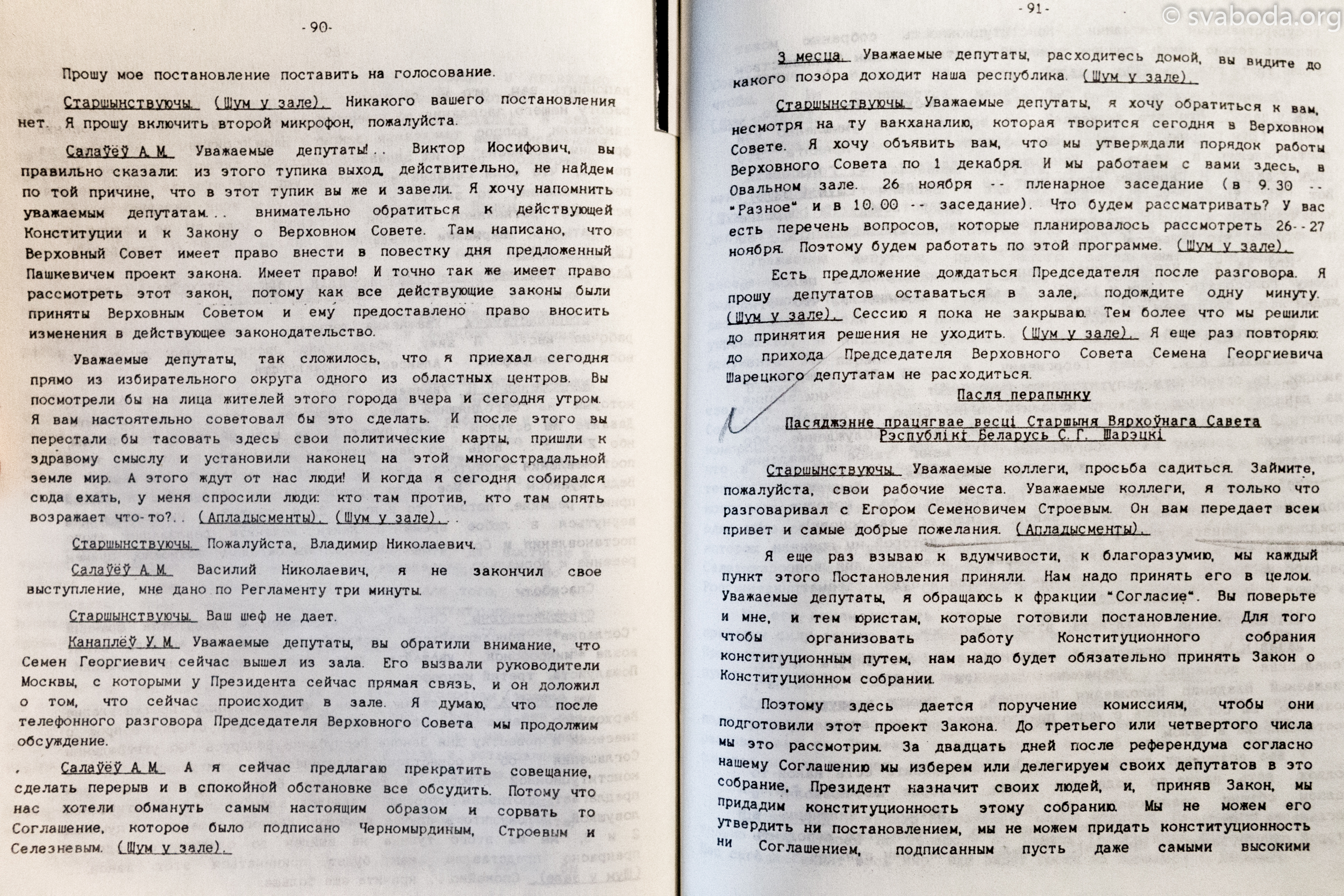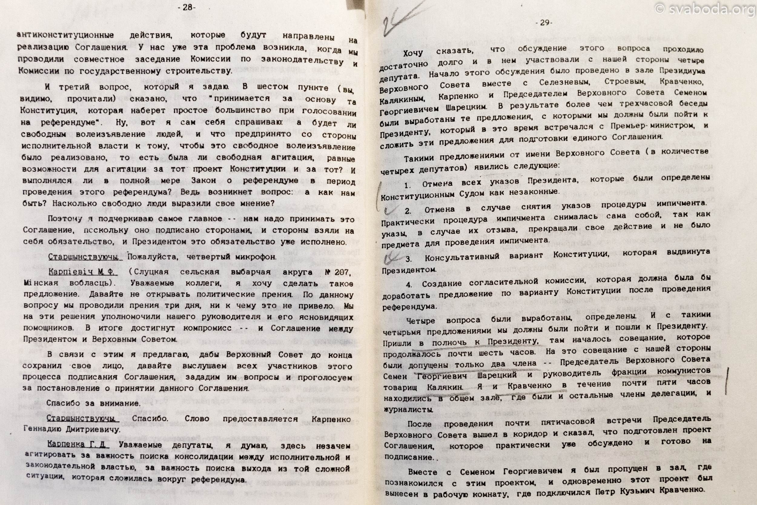 «Сямён Георгіевіч двойчы сказаў, што такое рашэньне Вярхоўны Савет прыме, паколькі ён нас зь Сяргеем Калякіным і Генадзем Карпенкам дэлегаваў і прадаставіў адпаведныя паўнамоцтвы для падпісаньня».