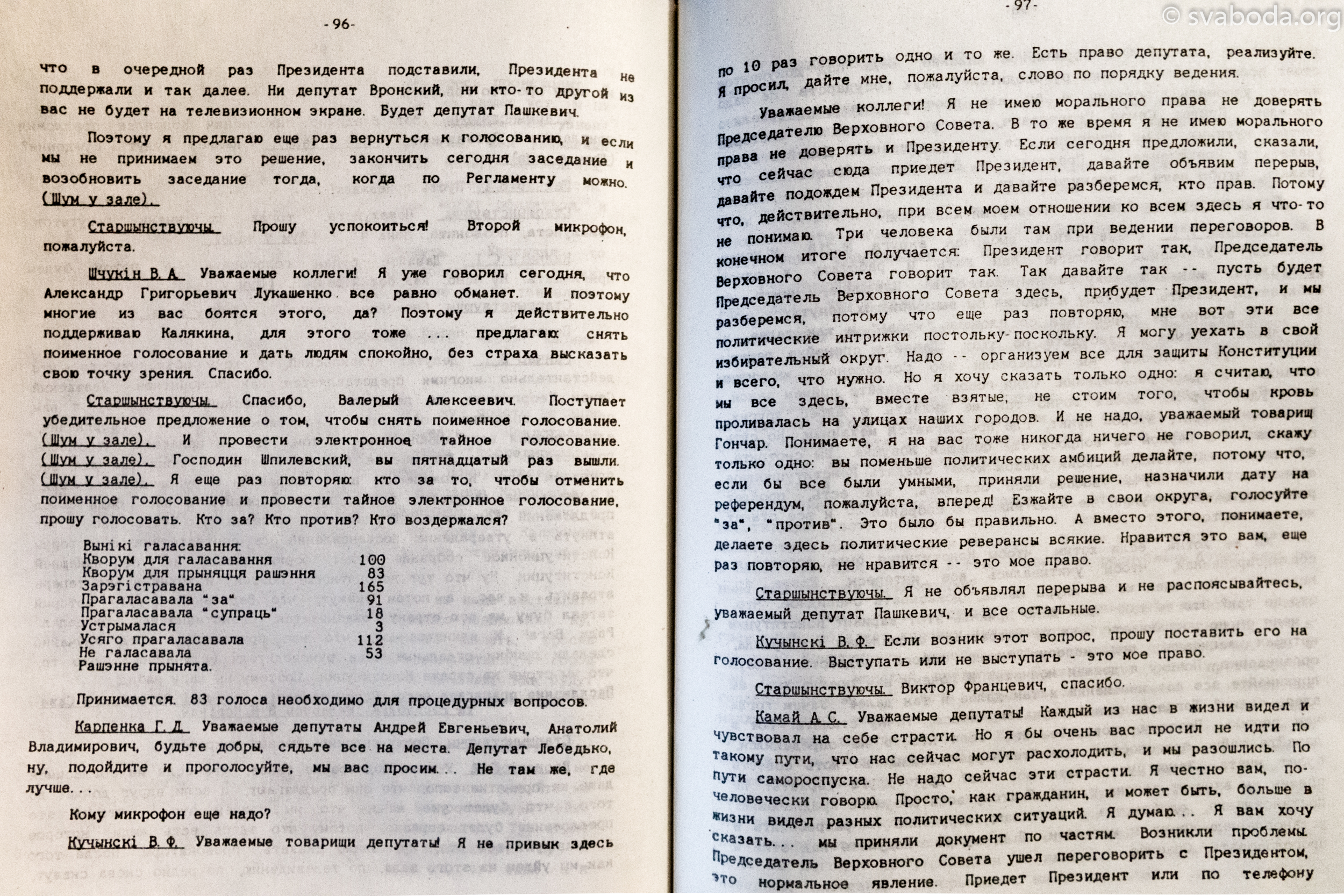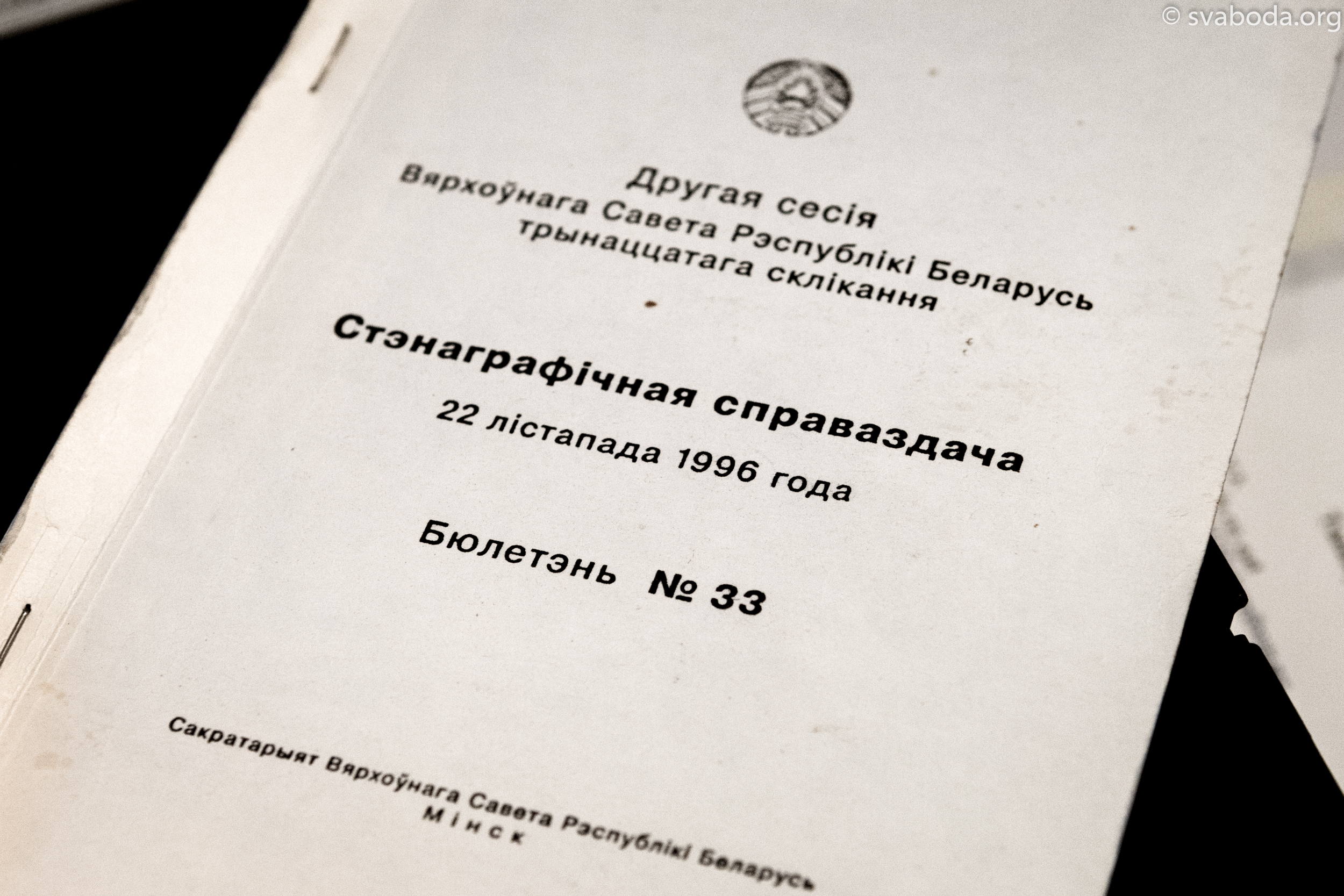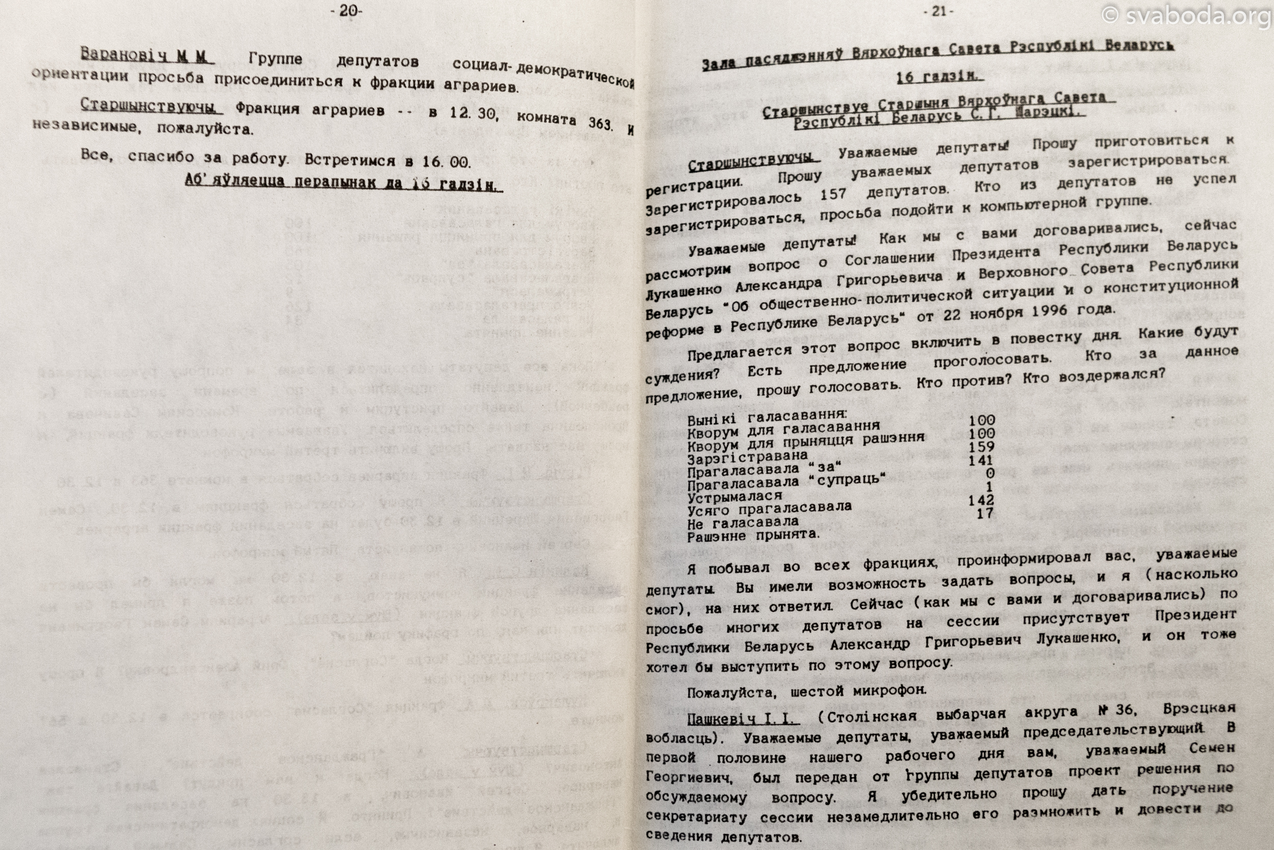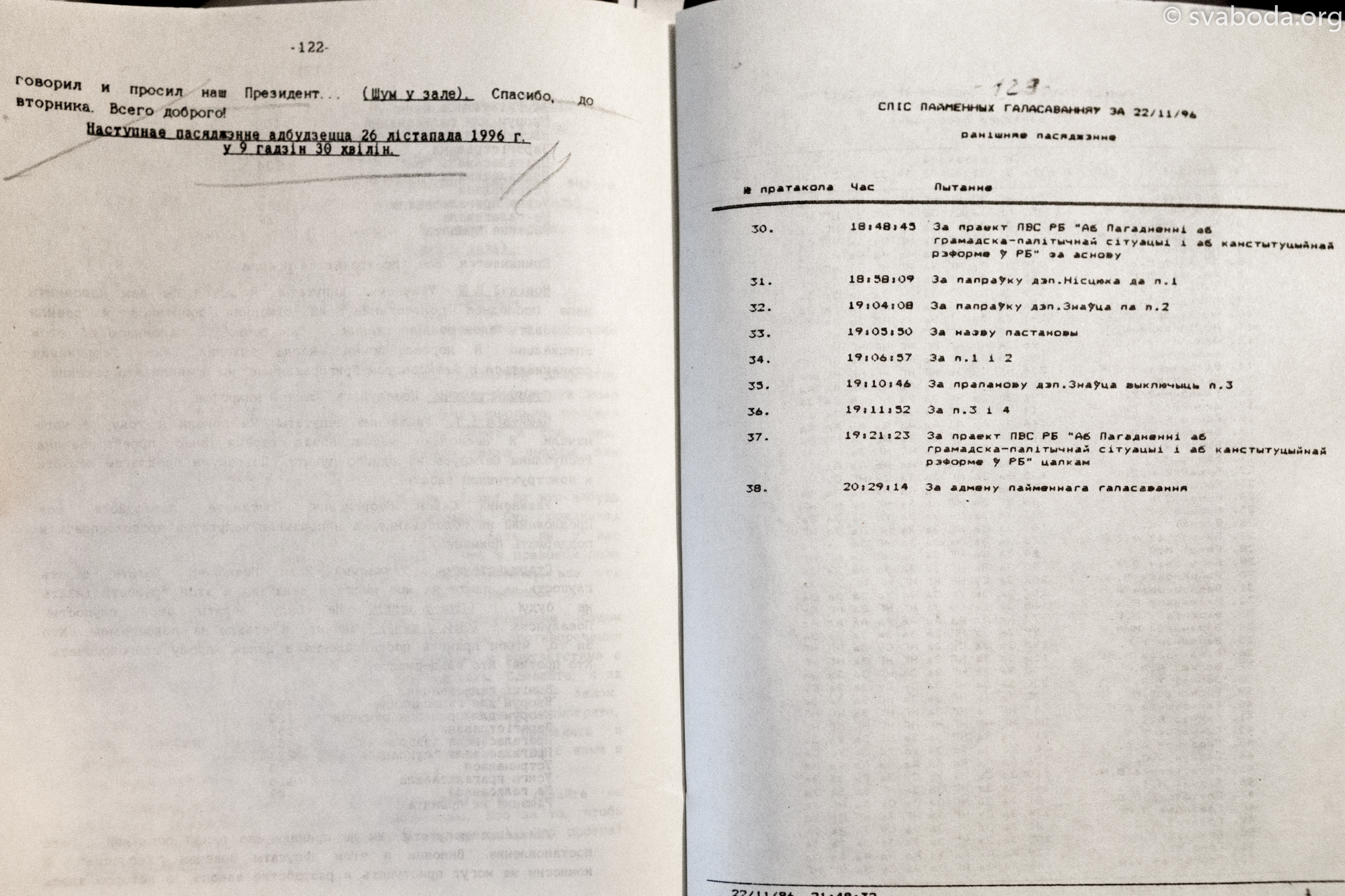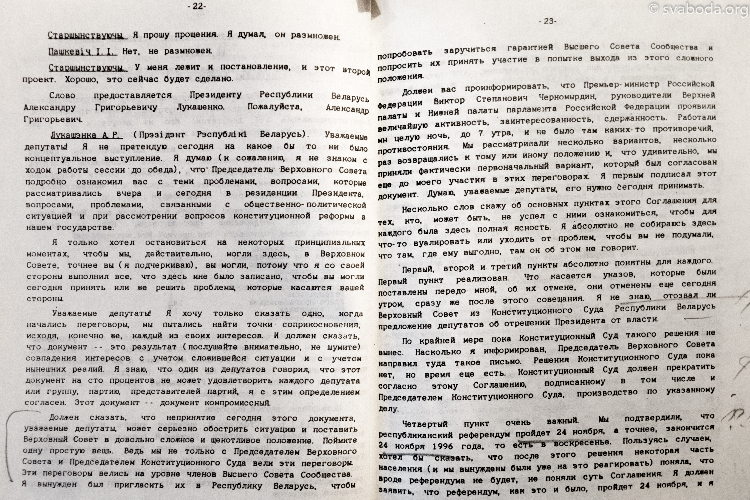 24 лістапада 1996 году Аляксандар Лукашэнка атрымаў неабмежаваную ўладу. Рэфэрэндум, не прызнаны міжнароднай супольнасьцю, надзяліў яго ня толькі выканаўчай уладай, якую ён меў паводле Канстытуцыі 1994 году, але і заканадаўчай. Свабода аднавіла апошні дзень працы парлямэнту на падставе стэнаграмы з пасяджэньня Вярхоўнага Савету 22 лістапада. Дакумэнт публікуецца ўпершыню.