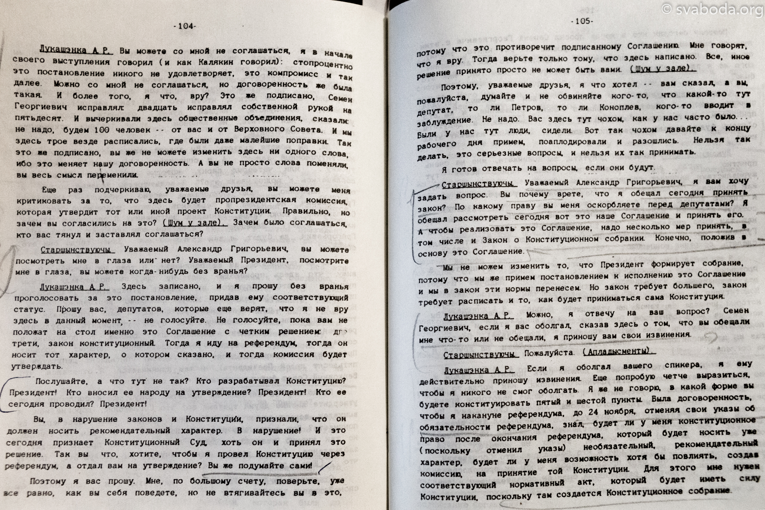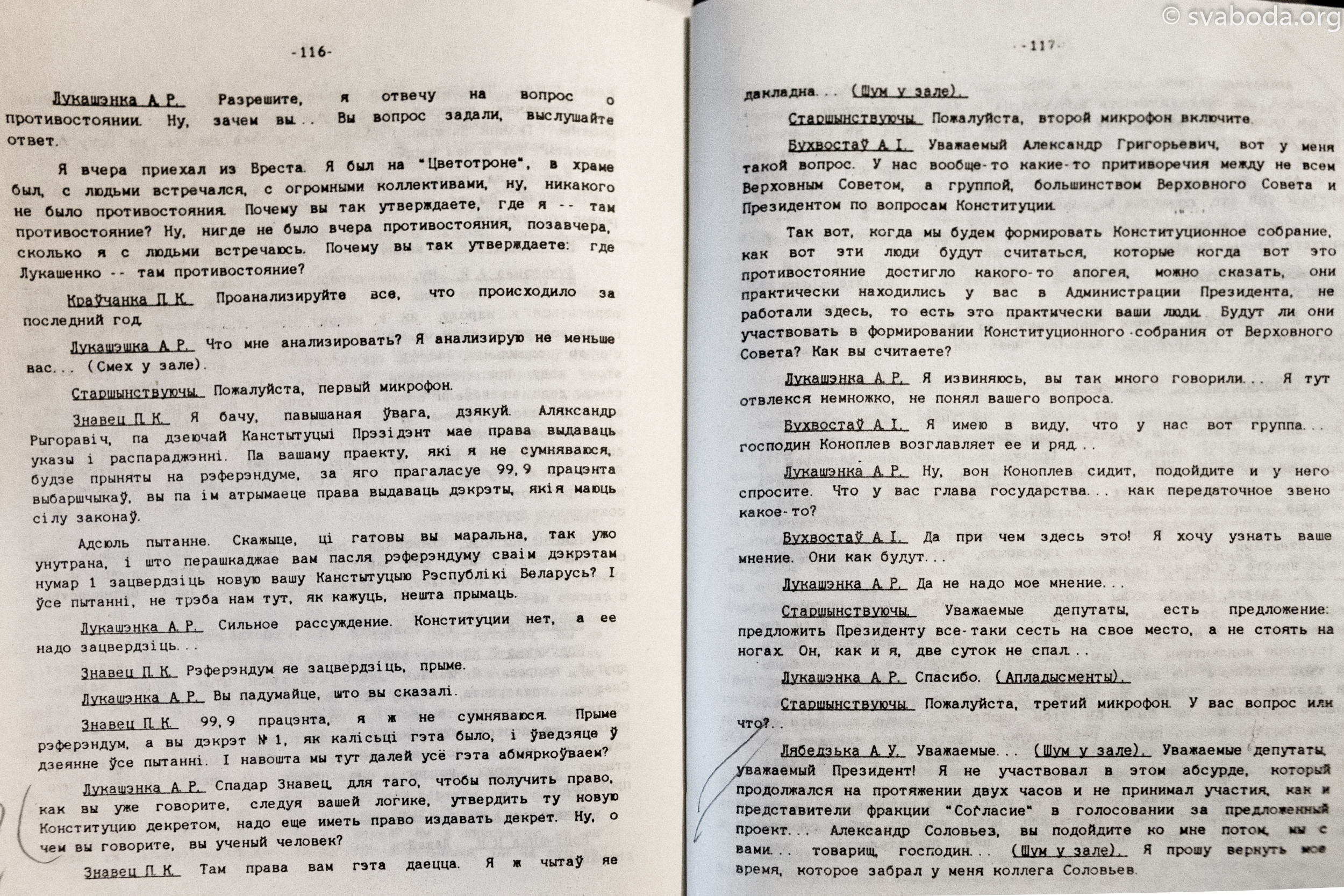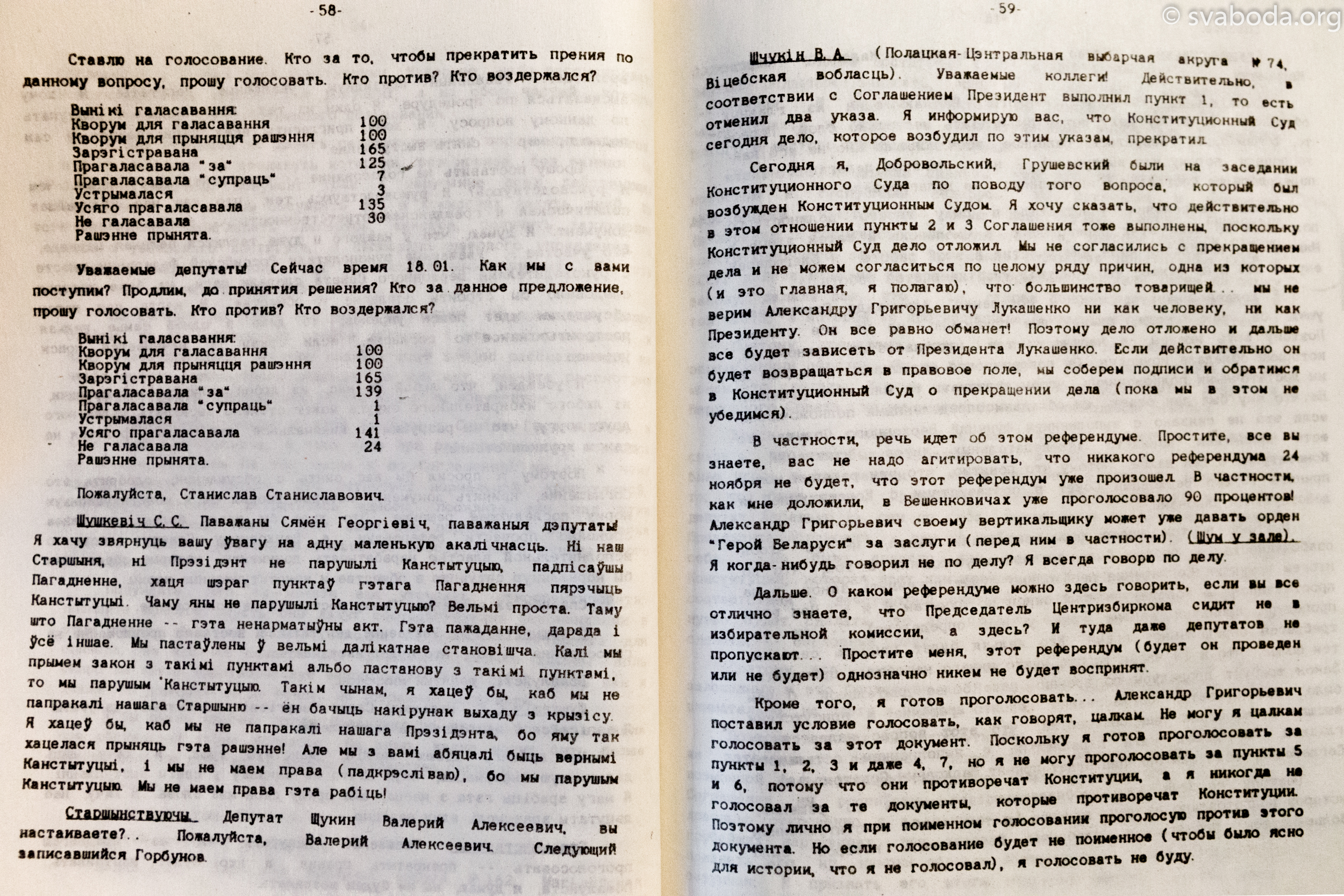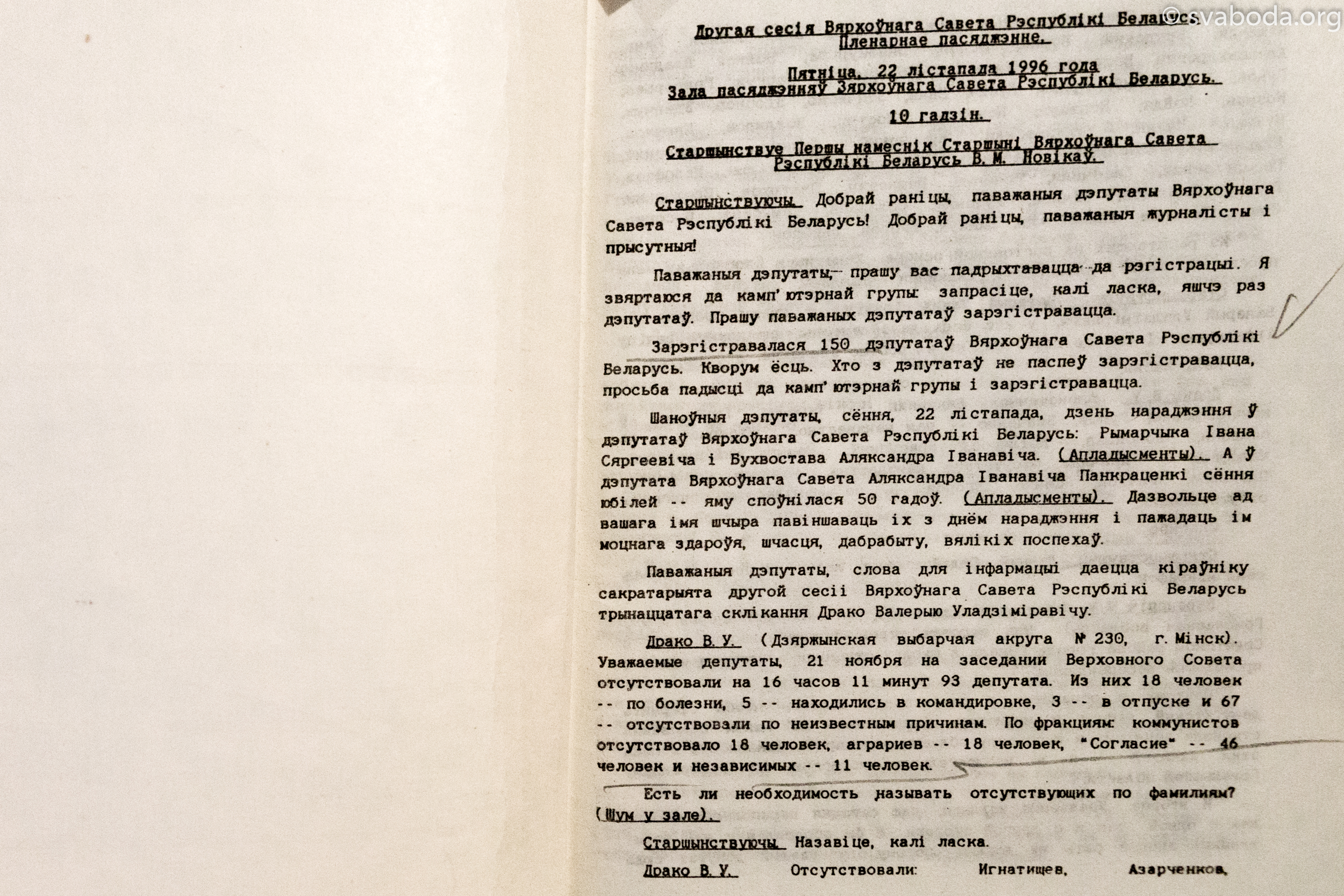 24 лістапада 1996 году Аляксандар Лукашэнка атрымаў неабмежаваную ўладу. Рэфэрэндум, не прызнаны міжнароднай супольнасьцю, надзяліў яго ня толькі выканаўчай уладай, якую ён меў паводле Канстытуцыі 1994 году, але і заканадаўчай. Свабода аднавіла апошні дзень працы парлямэнту на падставе стэнаграмы з пасяджэньня Вярхоўнага Савету 22 лістапада. Дакумэнт публікуецца ўпершыню.
