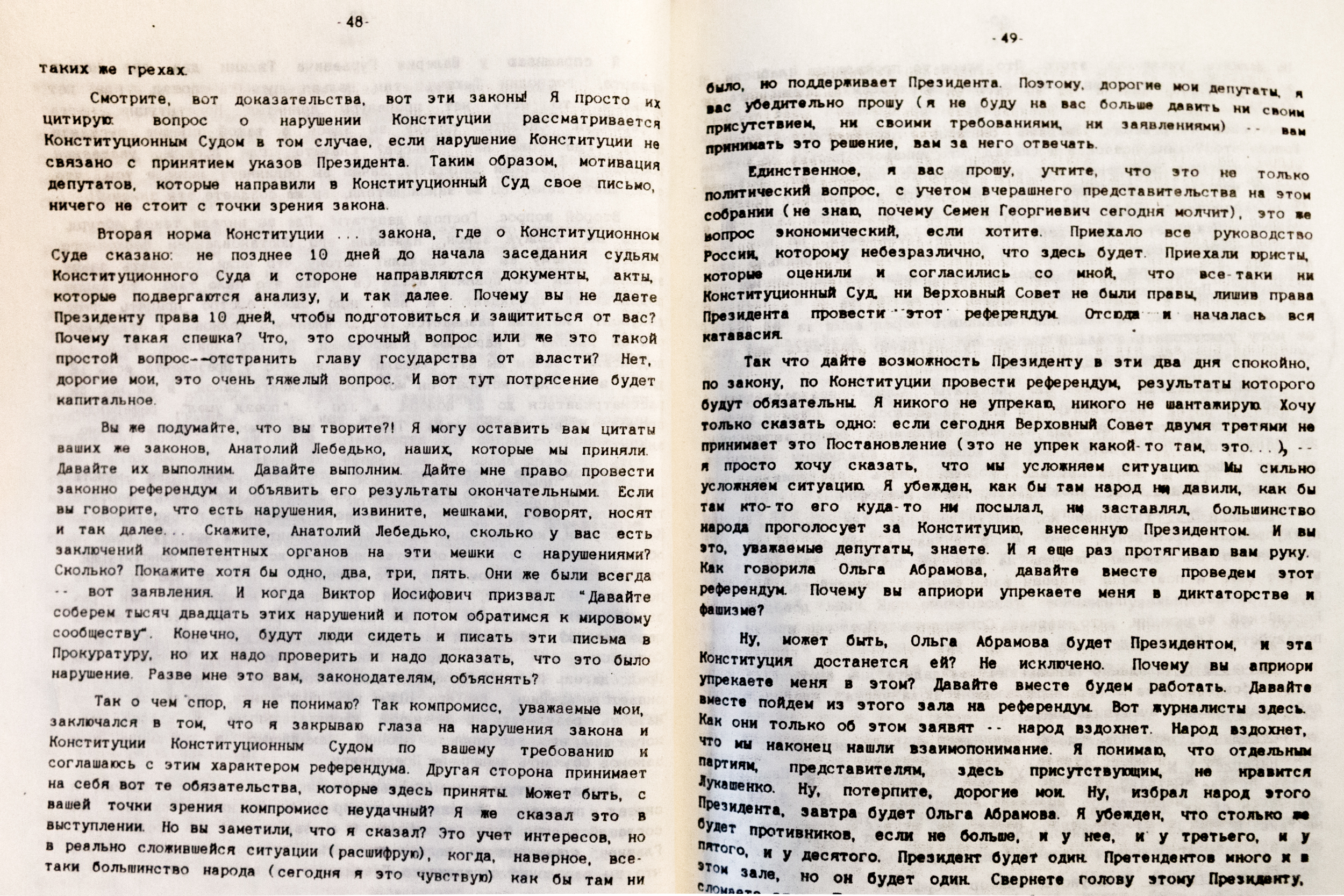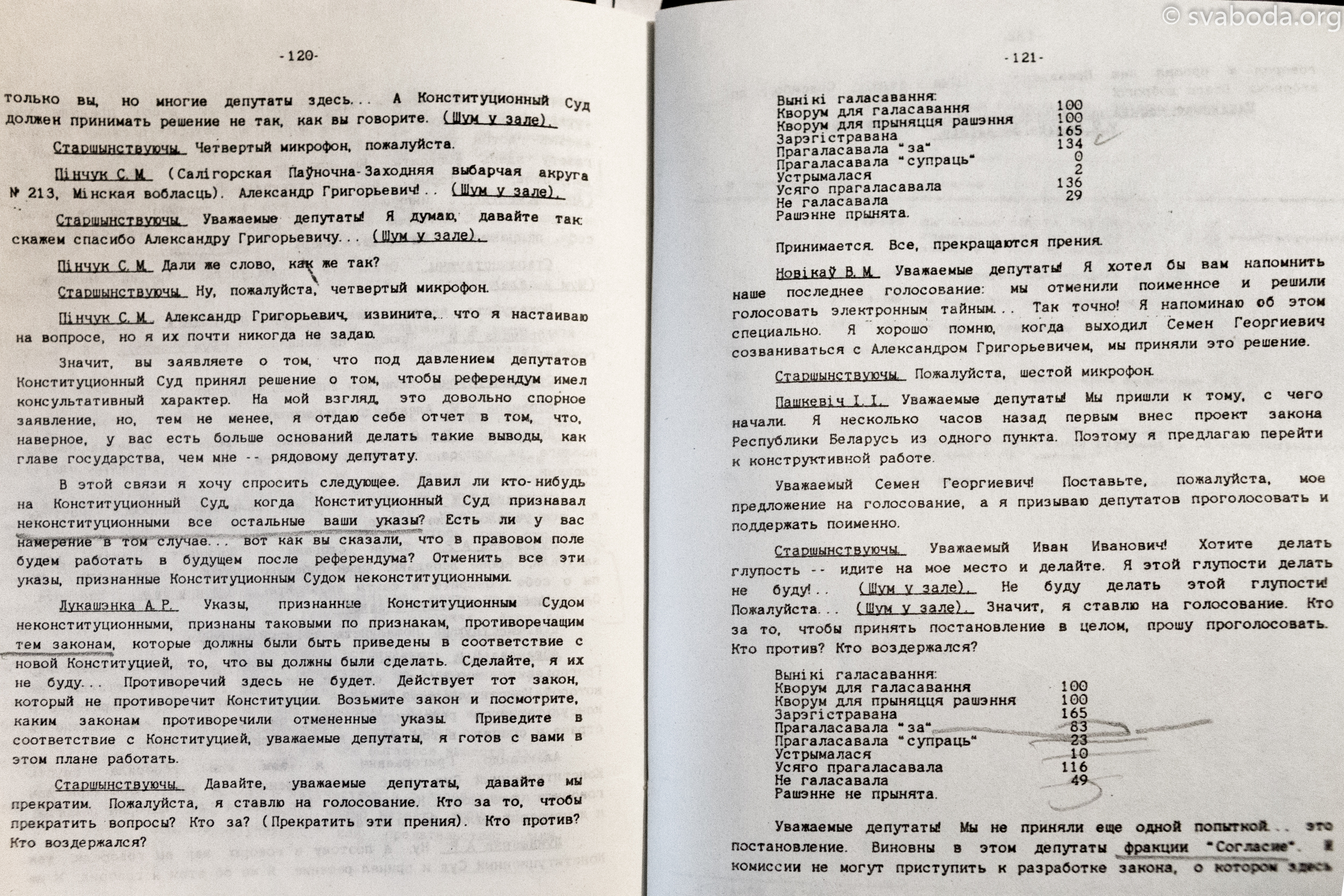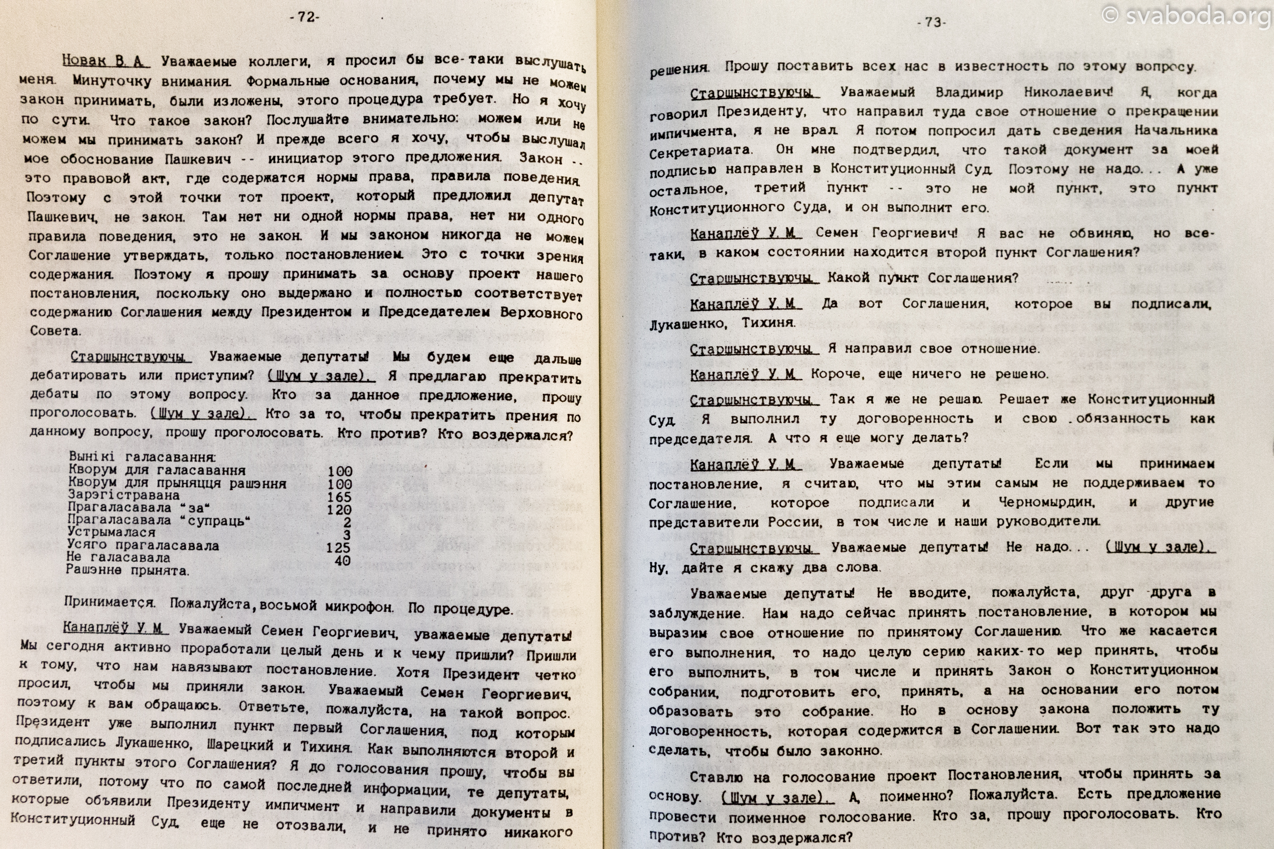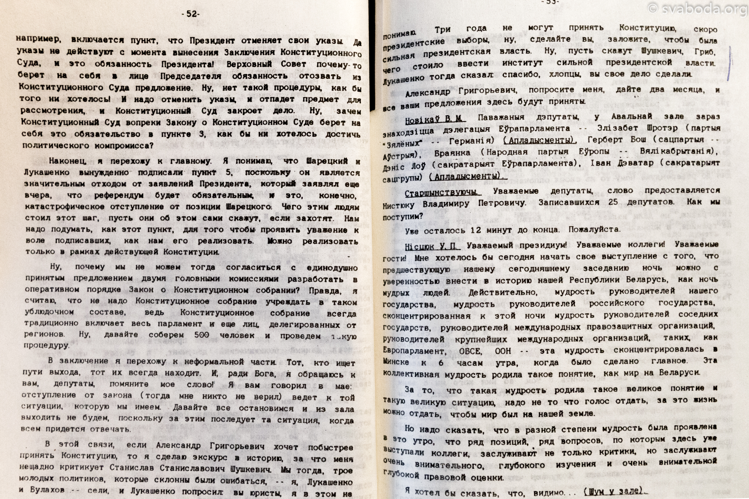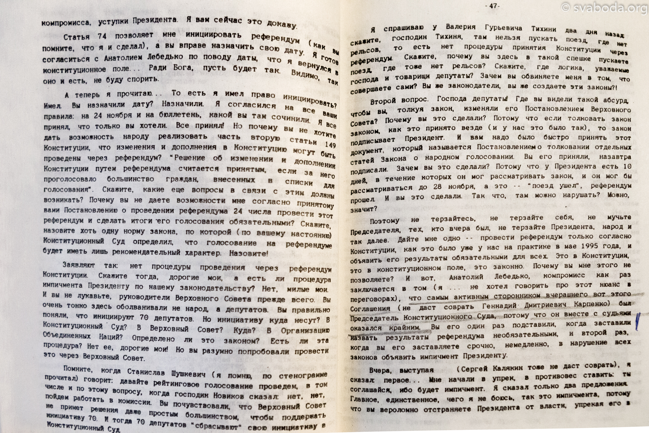 24 лістапада 1996 году Аляксандар Лукашэнка атрымаў неабмежаваную ўладу. Рэфэрэндум, не прызнаны міжнароднай супольнасьцю, надзяліў яго ня толькі выканаўчай уладай, якую ён меў паводле Канстытуцыі 1994 году, але і заканадаўчай. Свабода аднавіла апошні дзень працы парлямэнту на падставе стэнаграмы з пасяджэньня Вярхоўнага Савету 22 лістапада. Дакумэнт публікуецца ўпершыню.