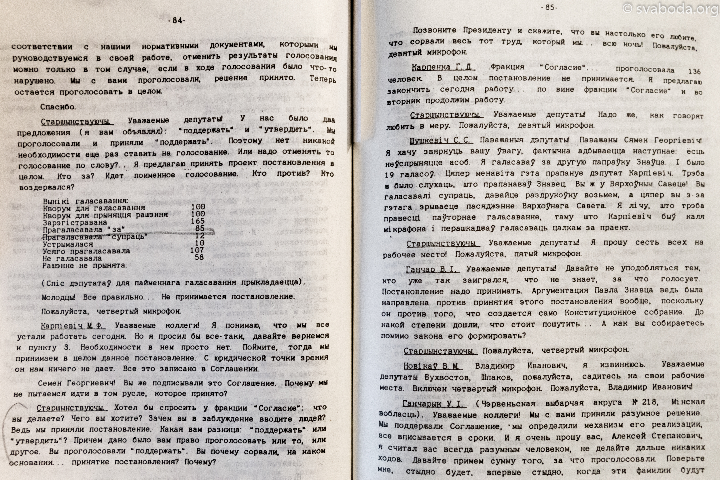 Пра пагадненьне галасавалі ў два этапы. Спачатку па кожным пункце. Усе пункты паасобку былі прынятыя. Але потым паставілі на галасаваньне ўсю пастанову цалкам. Тут ужо пачаліся спрэчкі па фармулёўках. Урэшце за начное пагадненьне дэпутаты Вярхоўнага Савету не прагаласавалі.
