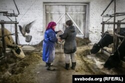 Жанчыны разьбіраюць мяхі з кармамі — кожны па 30–40 кіляграм. На кожную — 50–60 кароваў. Даярчына праца — карміць, мыць, даіць, цягаць вёдры з малаком. Каровы жуюць сена, лётаюць галубы, праз уваход відаць марозны ружовы сьвітанак — атмасфэра на фэрме амаль біблейская, каб ня рэзкі пах гною і не ператомленыя твары і паставы даярак.