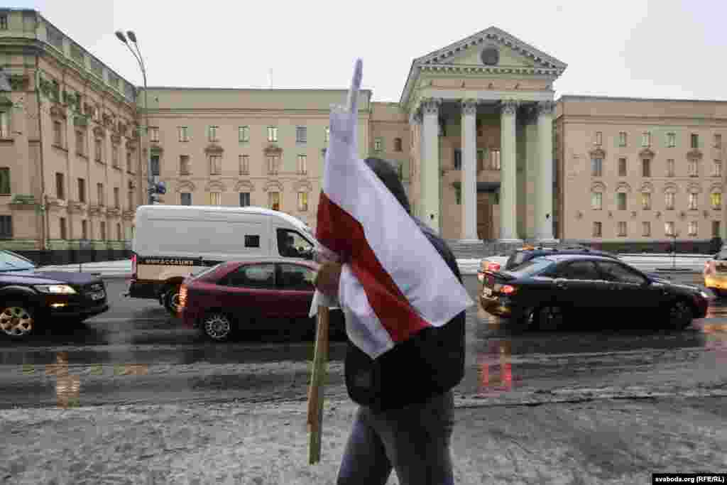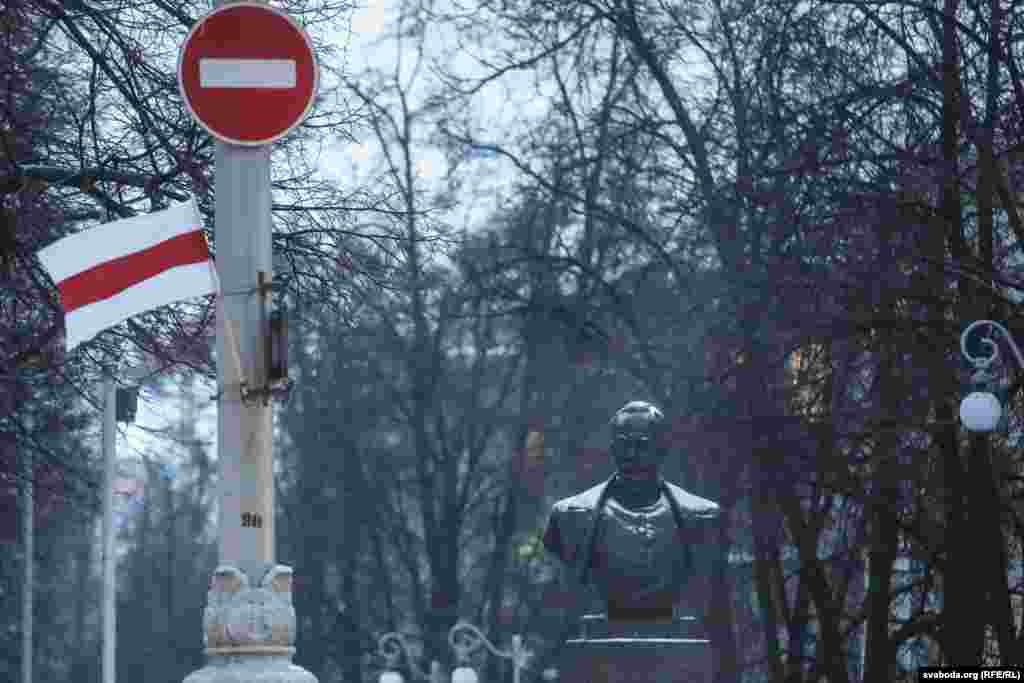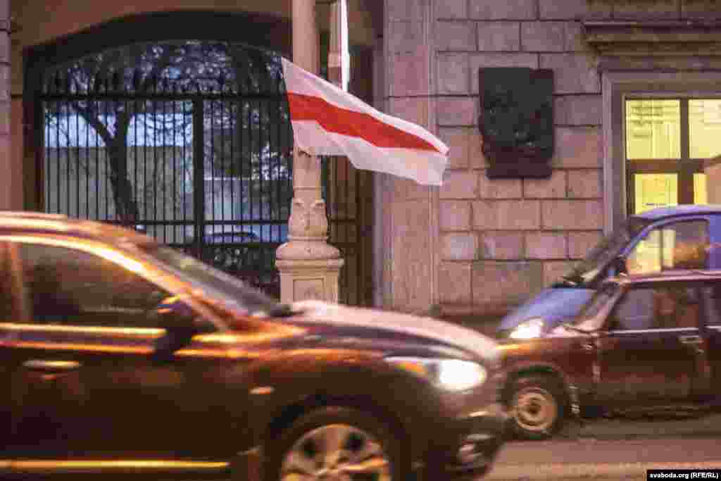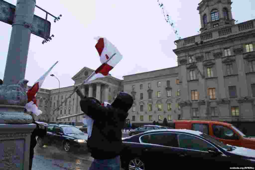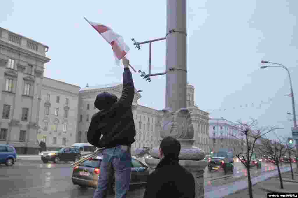 Актывісты «Маладога фронту» раніцай 8 сьнежня разьвесілі больш за два дзясяткі бела-чырвона-белых сьцягоў на праспэкце Незалежнасьці ў Менску.