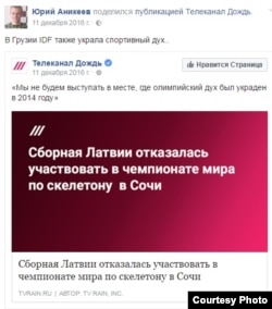 Юрый Анікееў, які нарадзіўся Іі вырас у Харкаве, вядзе адразу некалькі акаўнтаў у Сацыяльна сетках (у ЖЖ, Фэйсбуку, Твітэры, Укантакце) і нярэдка дае інтэрвію. Ён кажа, што сапраўды рабіў рэпост запісаў аб анэксіі Крыму і канфлікце на ўсходзе Ўкраіны, аднак потым выдаліў большасьць зь іх. На просьбу Радыё Свабода ён даслаў некалькі спасылак на свае запісы на форуме shashki.com, у якіх, паводле яго ўласных словаў, «прыводзіў сьведчаньні расейскай агрэсіі і заклікаў яе спыніць». Пасьля адхіленьня яго ад чэмпіянату Эўропы ў Грузіі Анікееў разьмясціў пост у «Фэйсбуку», параўнаўшы IDF з расейскімі ўладамі і спартовымі чыноўнікамі, абвінавачанымі Сусьветным антыдопінгавым агенцтвам у выбудоўваньні дзяржаўнай сыстэмы прыёму допінгу: