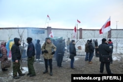 Абаронцы Курапатаў блякуюць будаўнічую тэхніку сабой. Курапаты, 24 лютага. Фотарэпартаж:
