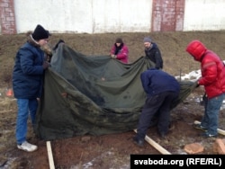 Паэт, былы кандыдат на прэзыдэнта Ўладзімер Някляеў разам з актывістамі ўсталёўваў вялікі намёт, у якім будзе больш зручна несьці начныя зьмены ў Курапатах.
