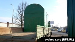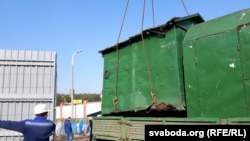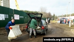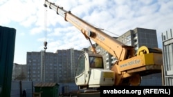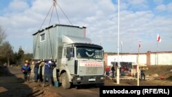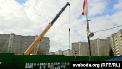 Тым часам кран выцягнуў з будоўлі яшчэ адну бытоўку, а на легкавіках будаўнікі вывезьлі зьвязку аранжавай сеткі і плястыкавыя блёкі, якімі агароджваюць месца рамонтных работ.