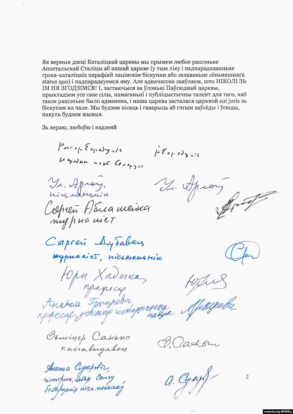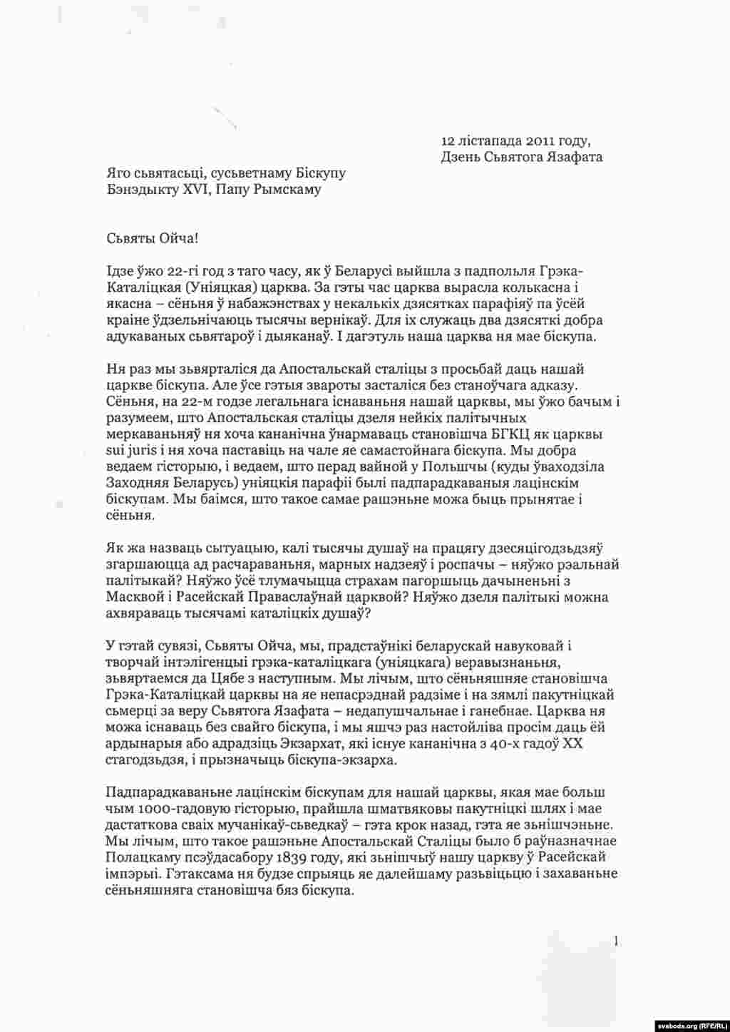 Ліст папу рымскаму ад беларускай грэка-каталіцкай інтэлігенцыі 12 лістапада 2011 году.