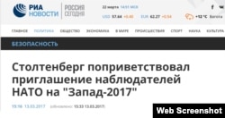 Ідэнтычная інфармацыя зьявілася і ў незалежных беларускіх выданьнях, парталах і сайтах. Сутнасьць гэтага паведамленьня была відавочная: Расея запрасіла NATO на вучэньні «Захад-2017. Крыніцай інфармацыі выступала «РИА Новости».