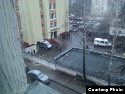 Каля прыступак будынку РУУС таксама затрыманыя. Біяпрыбіральні для іх тут паставілі яшчэ ў пятніцу 24 сакавіка, у чацьвер і пятніцу тут наводзілі парадак.