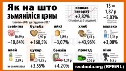 Радыё Свабода працягвае штомесячны маніторынг цэнаў у Беларусі на самыя неабходныя тавары. Мы адсочваем, колькі каштуюць на пачатку кожнага месяца 7 прадуктаў харчаваньня (сьвініна, бульба, яйкі, хлеб, малако, алей і цукар), а таксама аўтамабільнае паліва, праезд у грамадзкім транспарце і квіток у кінатэатар.