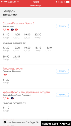 Ужо тры месяцы запар не зьмяняецца цана на квіток у кіно. Так, паглядзець блёкбастэр «Ахоўнікі галяктыкі. Частка 2» у бюджэтным кінатэатры «Беларусь» каштуе 6,5 рубля. У студзені мы там жа глядзелі «Елкі-5» за 5 рублёў, у лютым — камэдыю «Ла-ла-лэнд» за 6 рублёў. У сакавіку, красавіку і траўні квіток каштаваў 6,5 рубля.
