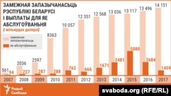 Запазычанасьць Беларусі ўдвая большая за прыбыткі бюджэту, яна складае 41,7% валавога ўнутранага прадукту. На выплату крэдытаў летась пайшло больш за 7 млрд рублёў — гэта як фінансаваньне абароны, праваахоўнікаў, нацыянальнай эканомікі, аховы здароўя, адукацыі, спорту і СМІ разам узятых.