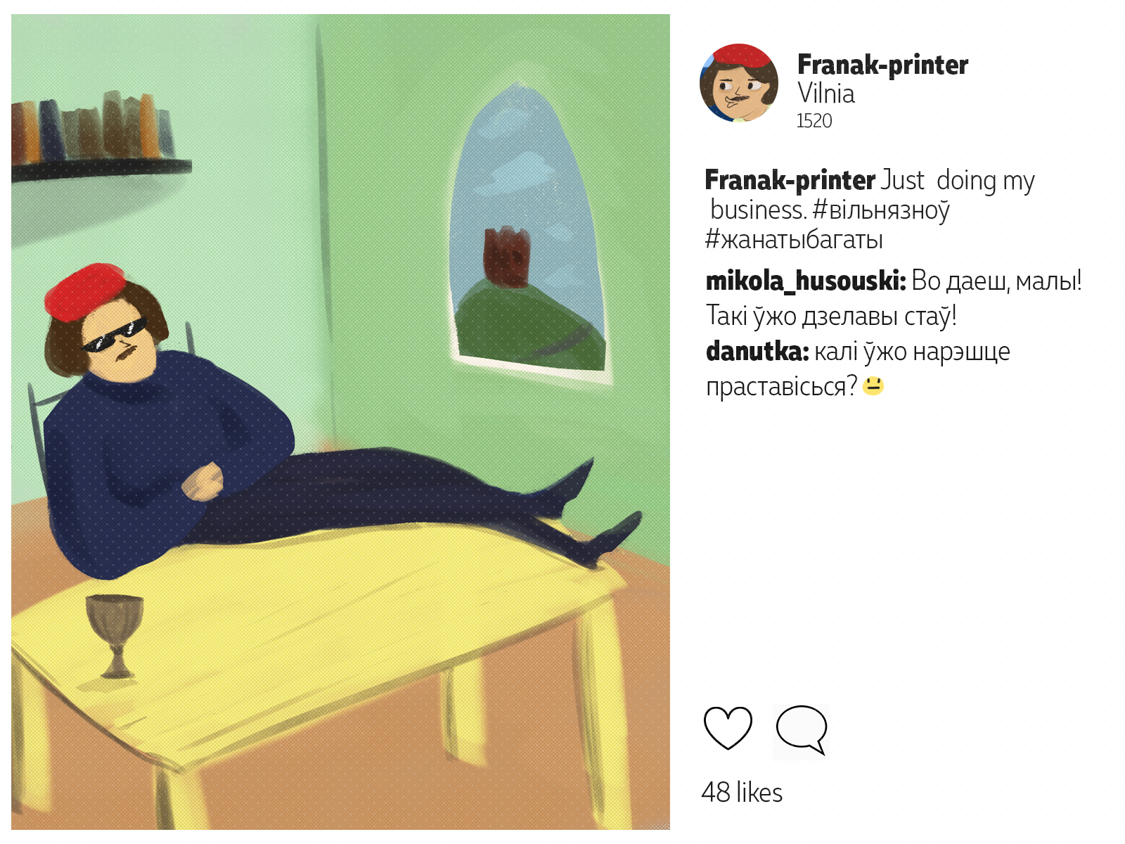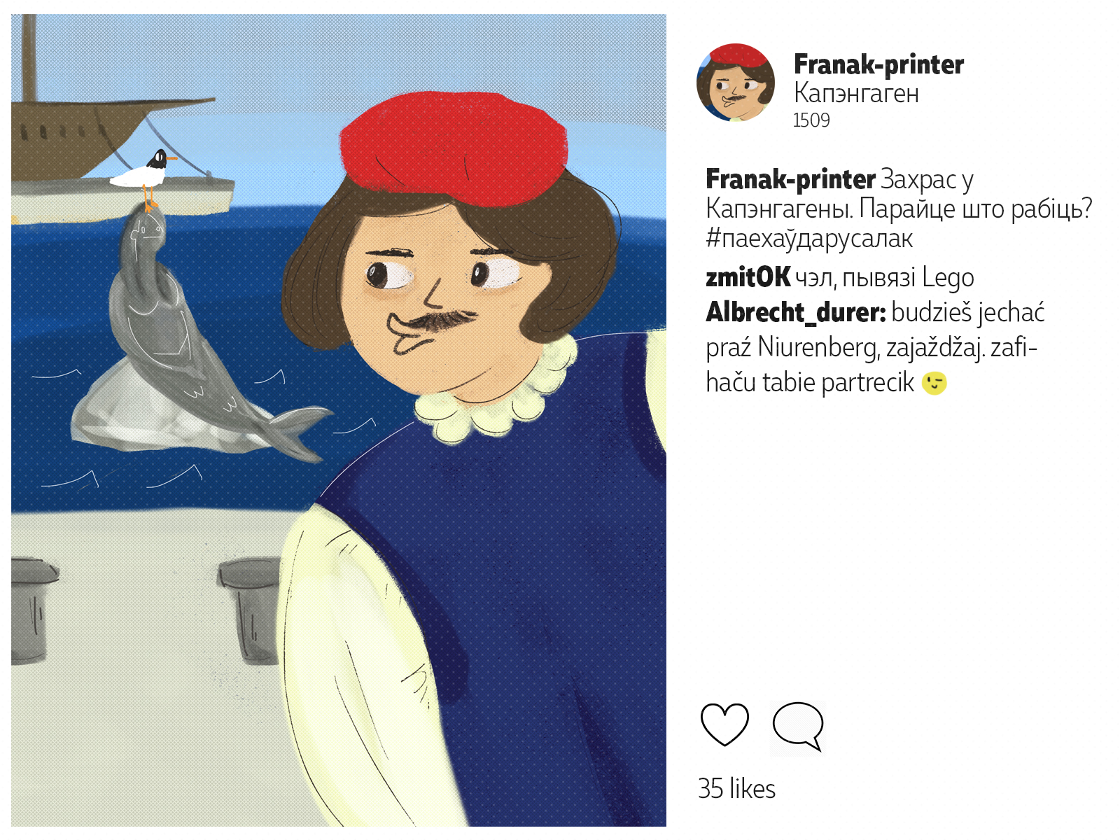 Францішак Скарына падарожнічаў ня менш за каторага сучаснага маладзёна. Ураджэнец Полацку, ён аб'ехаў палову Эўропы*: ад Вэнэцыі да Масквы. Пакінуў сьлед ва ўнівэрсытэтах Польшчы і Вэнэцыянскай рэспублікі, пры каралеўскіх дварах Даніі і Чэхіі. У Познані ён адседзеў у астрогу, а з Саксоніі ад яго ўцякаў Марцін Лютэр. Мы падумалі, што Скарына абавязкова карыстаўся б сацсеткамі. І вось як мог бы выглядаць ягоны інстаграм.