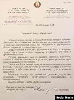 Ён зьвяртаецца, да міністра Сяргея Налівайкі, чый подпіс стаіць у лісьце: «Сяргей Эдуардавіч, дзякуй за ліст! Вельмі прыемна! :)»