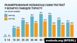 Сувязь з узростам — больш складаная. Можна было б дапусьціць, што чым бліжэй чалавек да натуральнай сьмерці, тым больш ён схільны разьвітацца з жыцьцём. Але гэтая гіпотэза няверная. Пік самазабойстваў у Беларусі прыпадае на 45-54 гады. Прычым гэтая заканамернасьць захоўваецца незалежна ад узроўню самазабойстваў у цэлым у грамадзтве — і пры высокім у 2000 годзе, і пры значна меншым у 2010 годзе максымум самазабойстваў прыпадае менавіта на ўзроставую кагорту 45-54 гады.