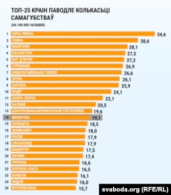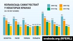 Як бачна з графіку, у Беларусі гэты паказьнік значна вышэйшы за гэты сярэдні па сьвеце, беларусы ў сярэднім у 5-7 разоў часьцей ідуць на самазабойства, чым беларускі.