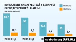 У 2016 годзе 2042 жыхары Беларусі скончылі самагубствам — 1656 мужчынаў і 386 жанчын. Мала гэта ці шмат? Існуе пабытовае ўяўленьне, што суіцыд — даволі рэдкая зьява. Між тым колькасьць самазабойстваў у шмат разоў пераўзыходзіць колькасьць забойстваў у грамадзтве, і гэта не асаблівасьць Беларусі летась, так было і ёсьць ва ўсім сьвеце.