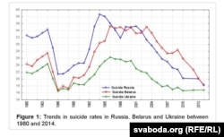 Паводле дадзеных Развадоўскага, у 1980-2014 гадах дынаміка колькасьці суіцыдаў на 100 тысячаў насельніцтва ў Беларусі, Расеі і Ўкраіне была вельмі падобнай: істотнае падзеньне ў 1986 годзе, потым імклівы рост да рэкордна высокіх паказьнікаў (якія перавышалі ўзровень паказьнікаў пачатку 80-х) і таксама рэзкае зьніжэньне з пачатку нулявых гадоў. У Расеі ў першай палове 90-х адпаведны паказьнік узьляцеў да 38, у Беларусі назіралася «плато» на ўзроўні 34-36 з канца 90-х па пачатак нулявых. Ва Ўкраіне колькасьць самазабойстваў на 100 тысячаў насельніцтва была ніжэйнай, чым у Беларусі і Расеі, але траекторыя падобная — «горб» на мяжы тысячагодзьдзя і зьніжэньне ў апошнія гады.