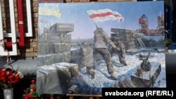 Сёньня ж каля мэмарыяльнай дошкі ў гонар Алеся Чаркашына, Віталя Ціліжэнкі ды Міхася Жызьнеўскага ўкраінскі мастак Тарас Носар прэзэнтаваў сваю новую карціну, прысьвечаную беларусам, якія ў студзені 2015 году ўзьнялі ў Пясках бел-чырвона-белы сьцяг.