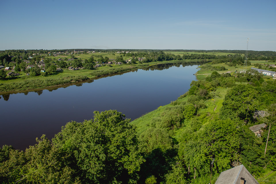 Краявід на Друю (зьлева) і Піедрую (справа) зь вежы касьцёла ў Піедруі