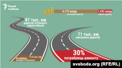 Асноўная частка грошай — 4,173 млрд рублёў — пойдзе на «разьвіцьцё і ўтрыманьне» рэспубліканскіх дарог, яшчэ 1,432 млрд хочуць накіраваць на «рамонт і ўтрыманьне» мясцовых.